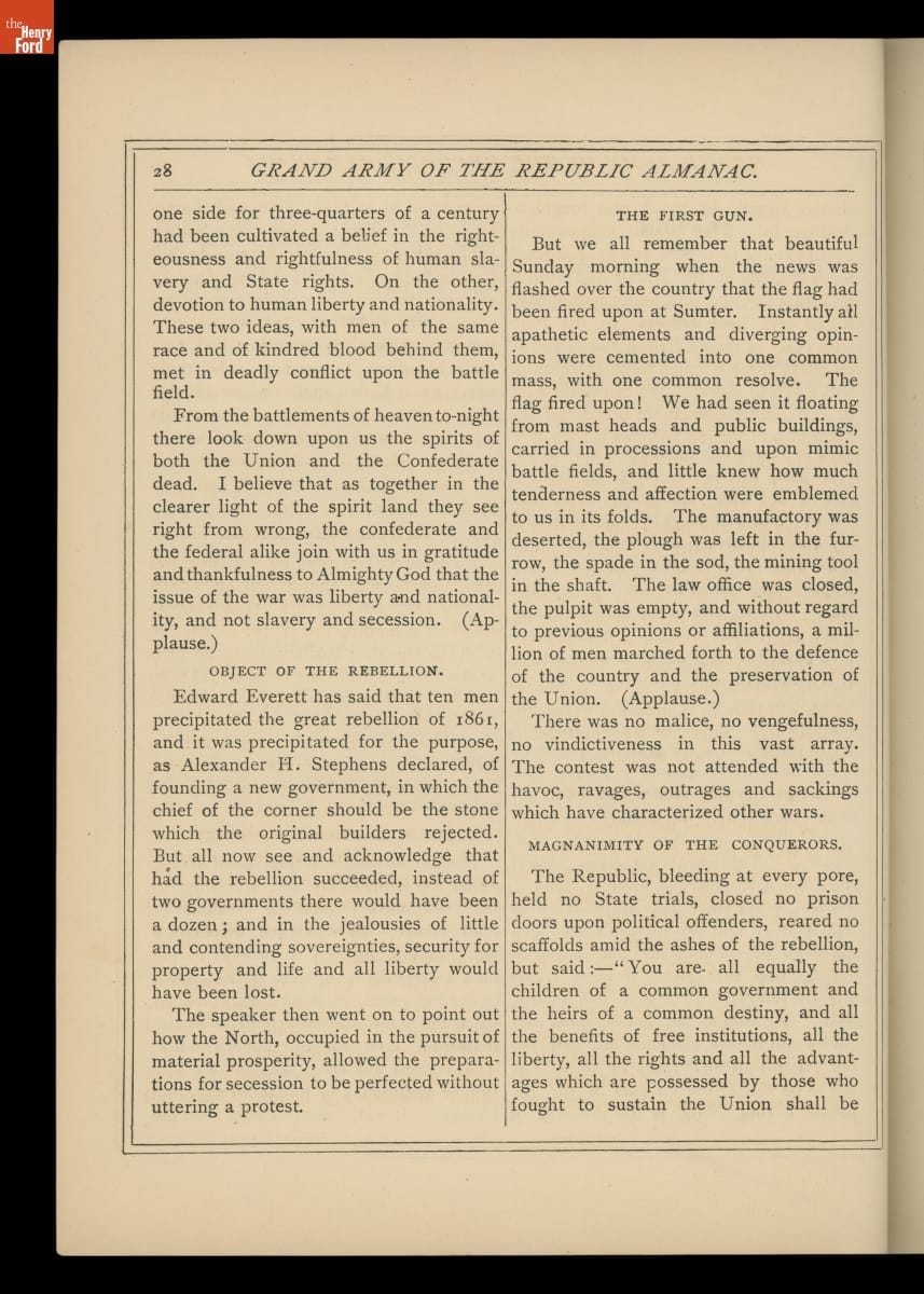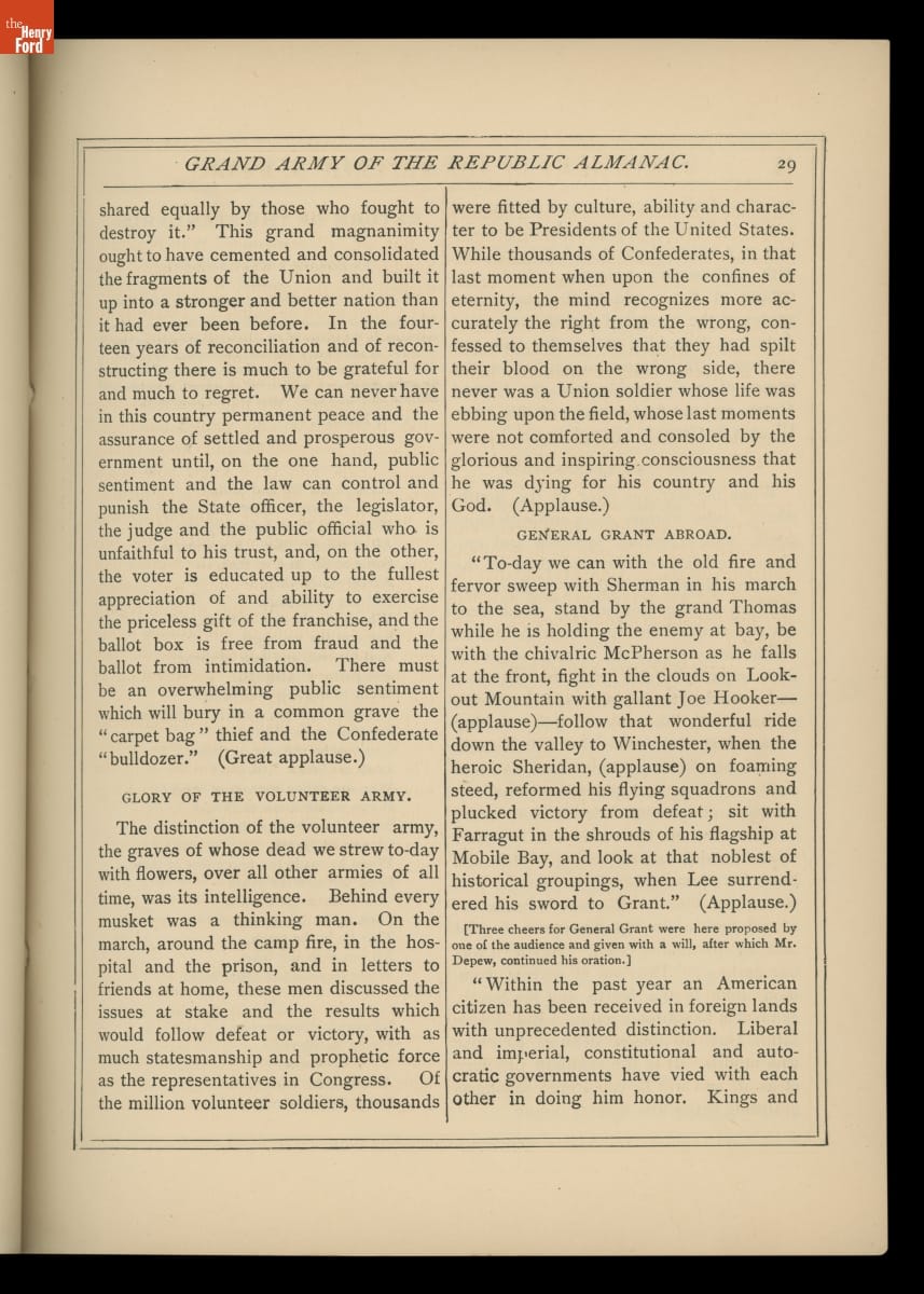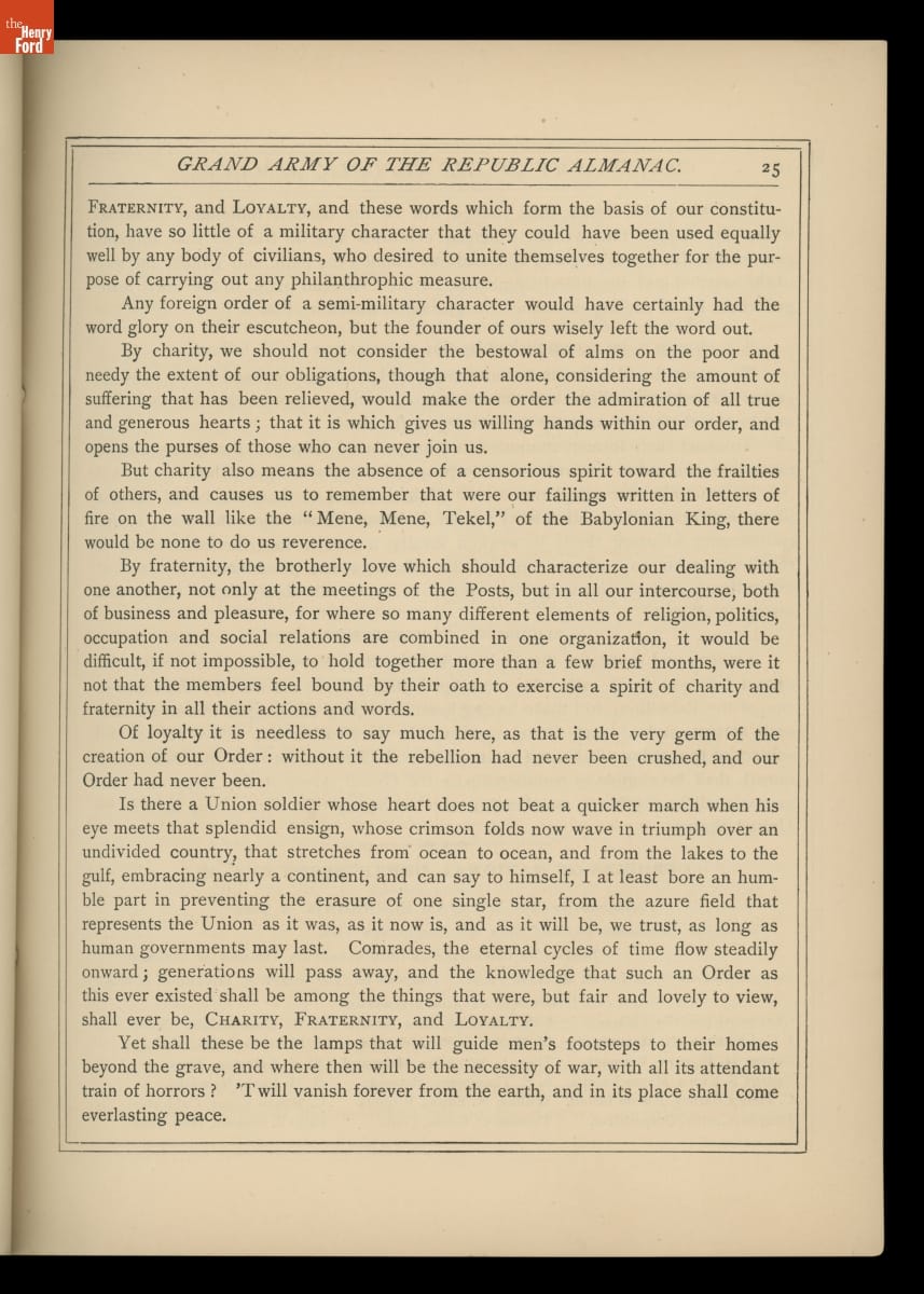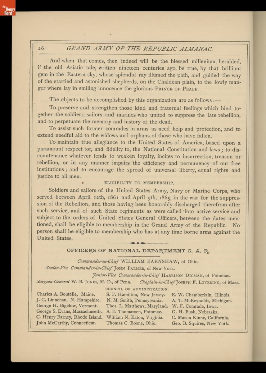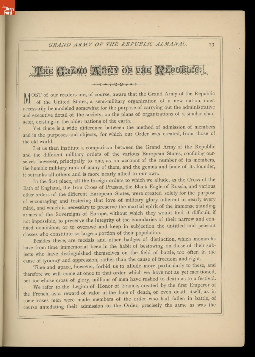 The Grand Army of the Republic (G.A.R.) was a Civil War Union veterans' organization formed in 1866. Local G.A.R. posts sprang up in small towns and big cities, where members came together for camaraderie. G.A.R. members also sponsored Civil War monuments, and pledged to assist needy veterans and their families. By 1890--at its peak--over 400,000 Civil War veterans were G.A.R. members.