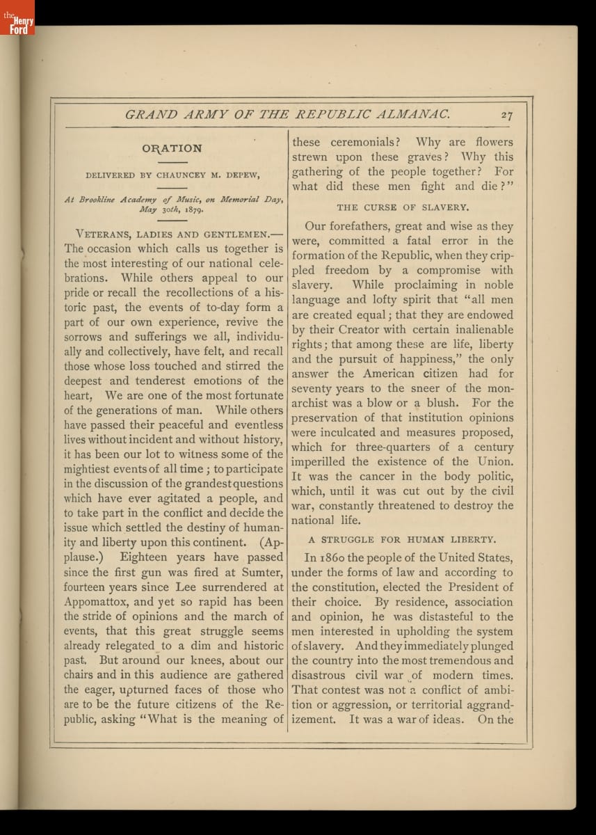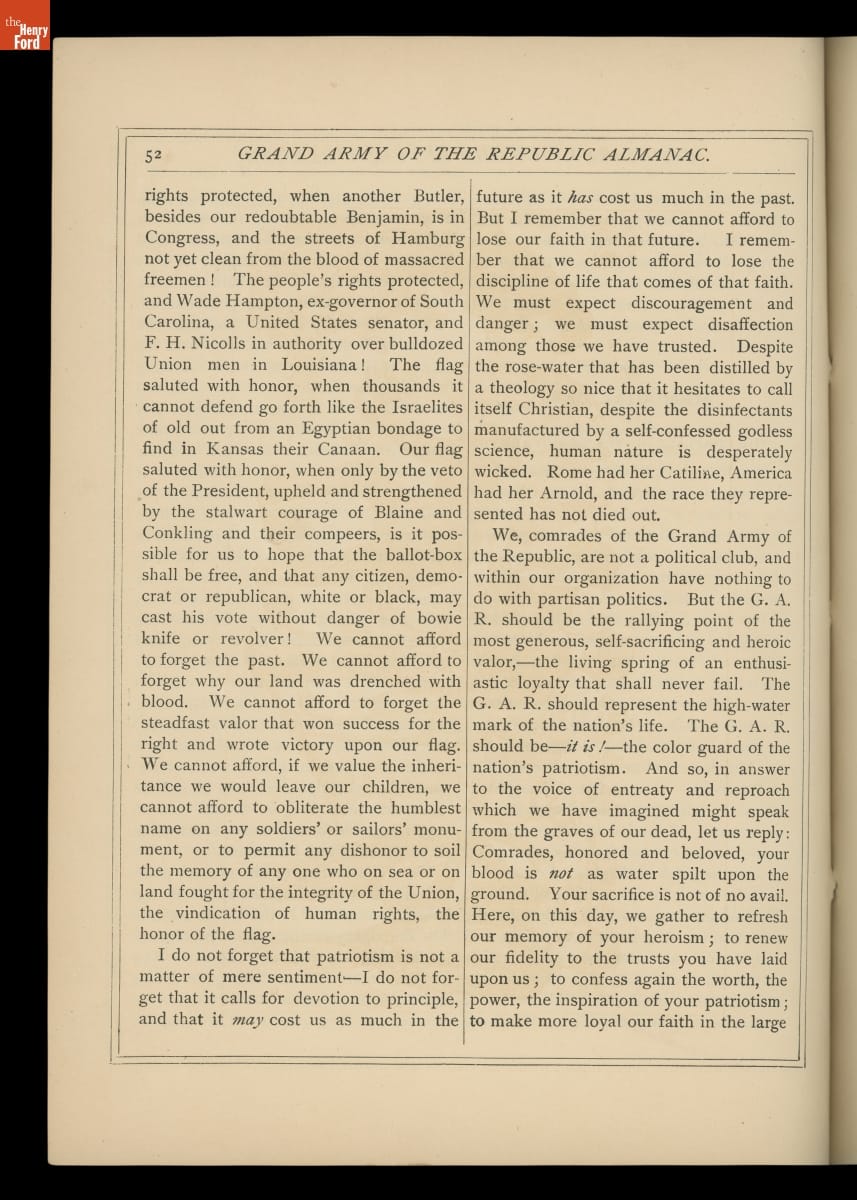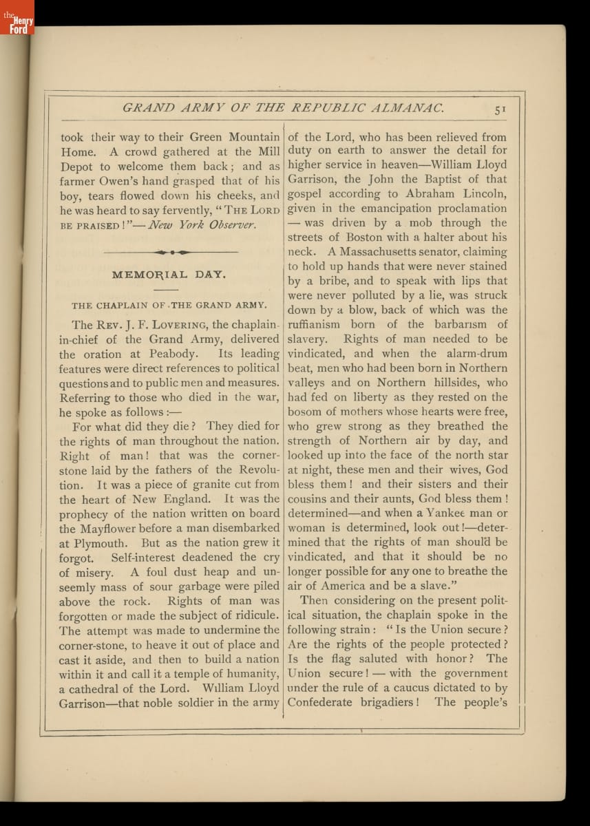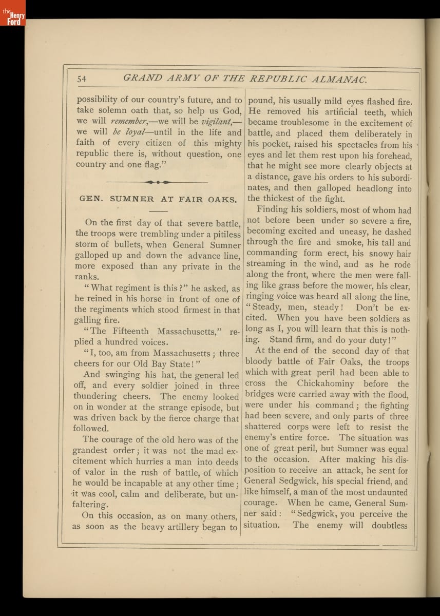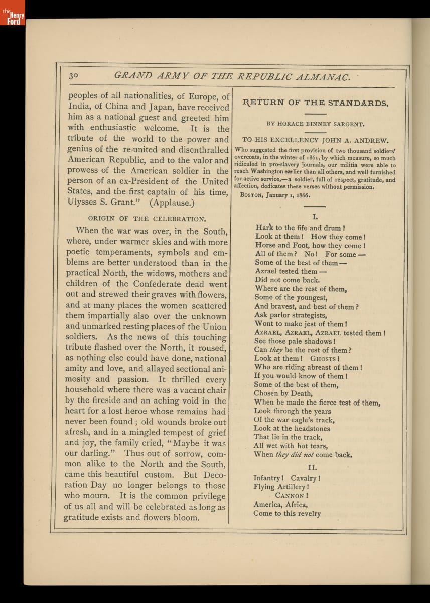 The Grand Army of the Republic (G.A.R.) was a Civil War Union veterans' organization formed in 1866. Local G.A.R. posts sprang up in small towns and big cities, where members came together for camaraderie. G.A.R. members also sponsored Civil War monuments, and pledged to assist needy veterans and their families. By 1890--at its peak--over 400,000 Civil War veterans were G.A.R. members.