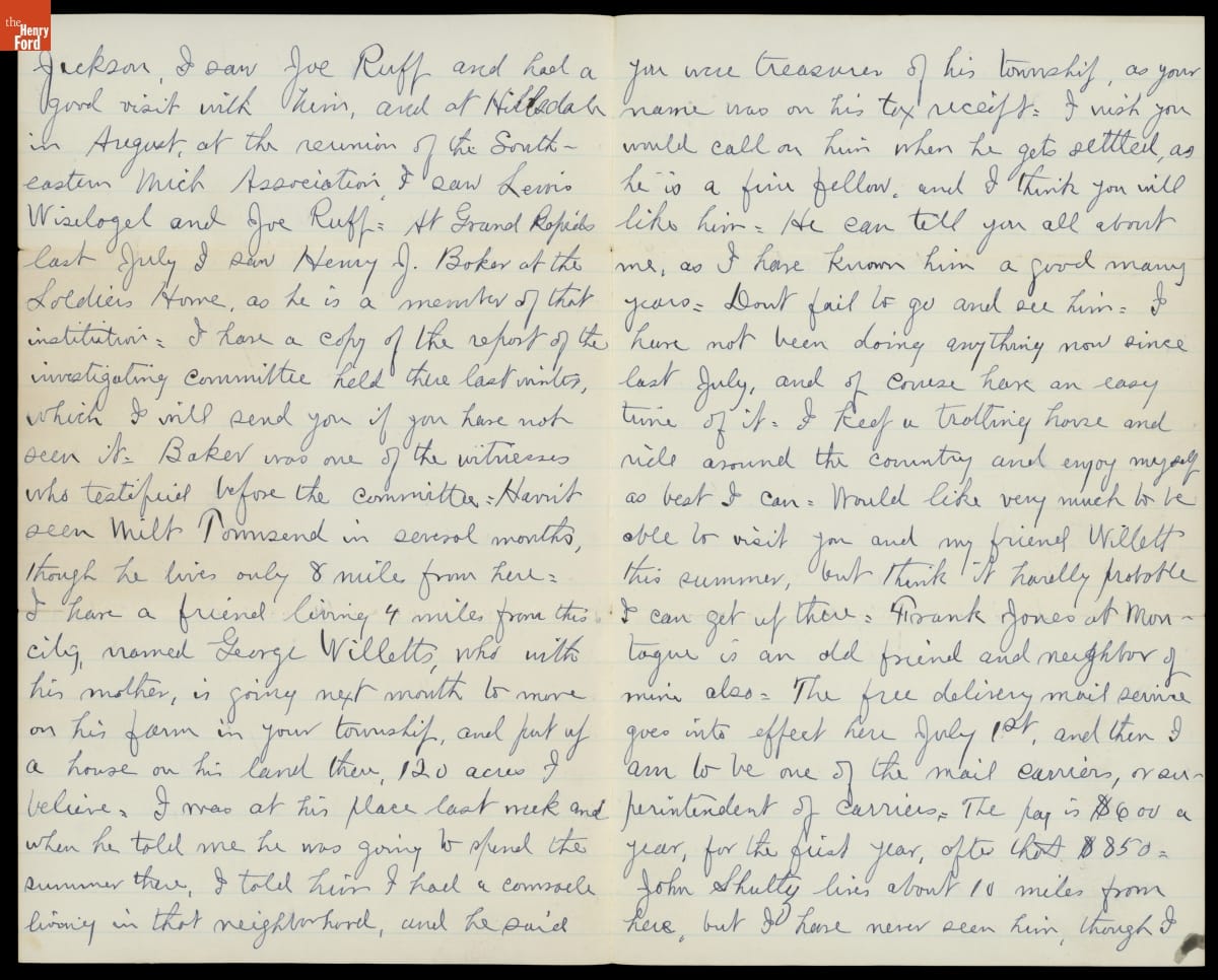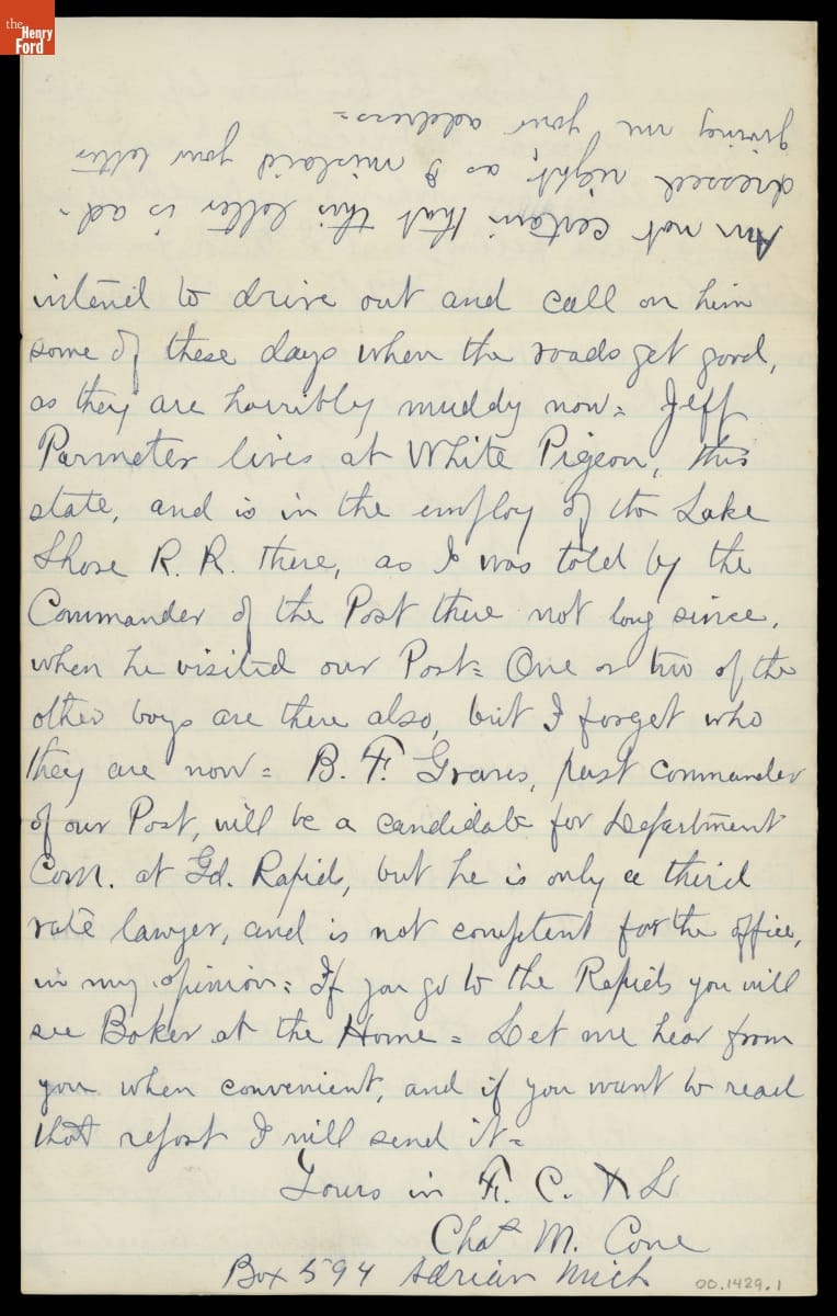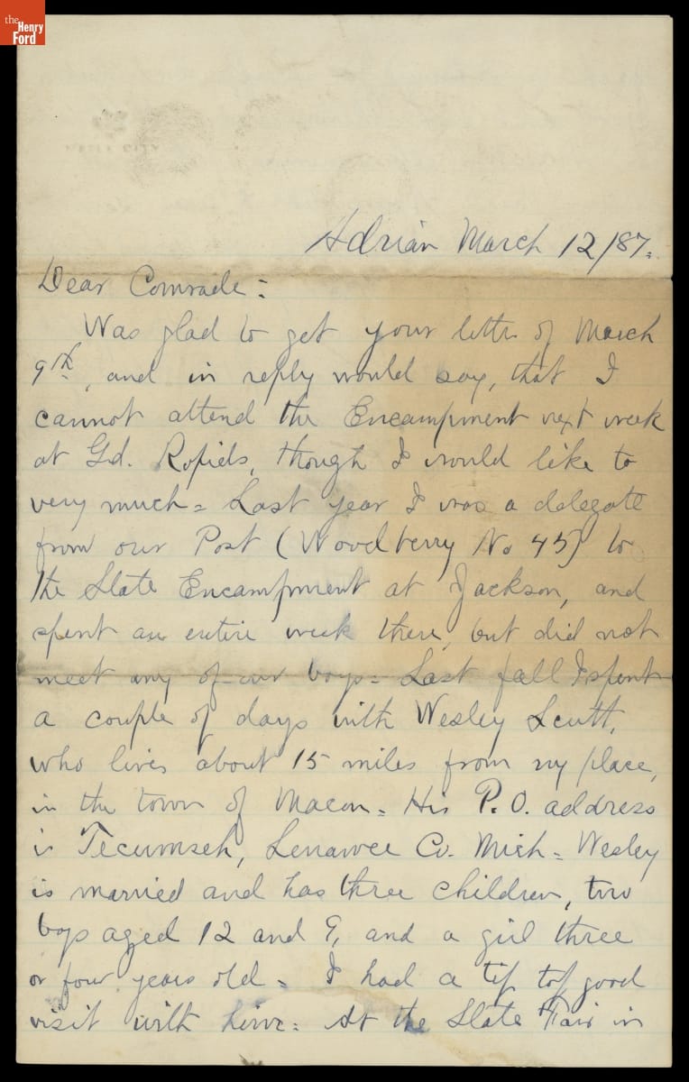 Charles M. Cone wrote his "Dear Comrade" that he would not be able to attend the 1887 Grand Army of the Republic, Michigan Department, Encampment in Grand Rapids. He did, however, update his friend about other members in his local Post. Cone signed off, "F. C. & L." an acronym for "Fraternity, Charity and Loyalty" -- the guiding principles of the Grand Army of the Republic.