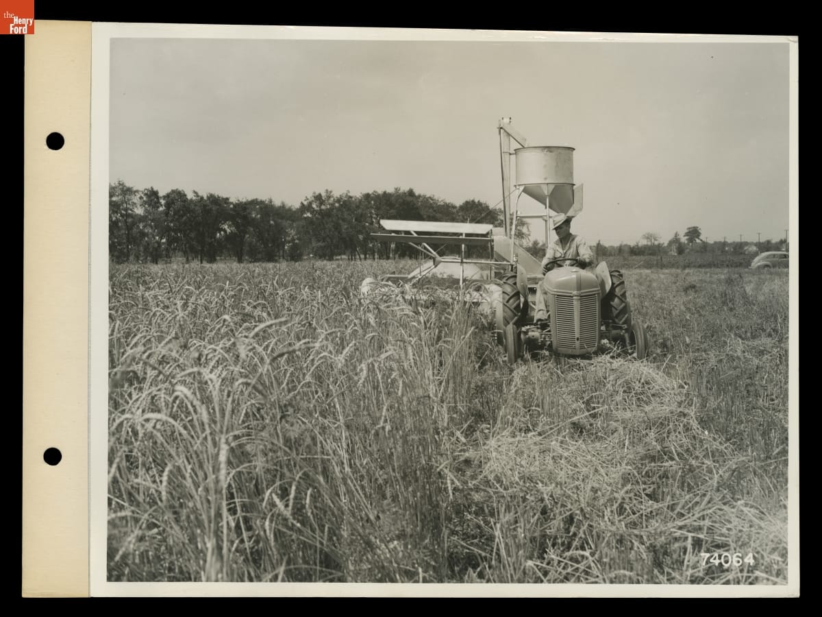 Man Driving a Ford-Ferguson Tractor with Ferguson Combine Attached, August 1940