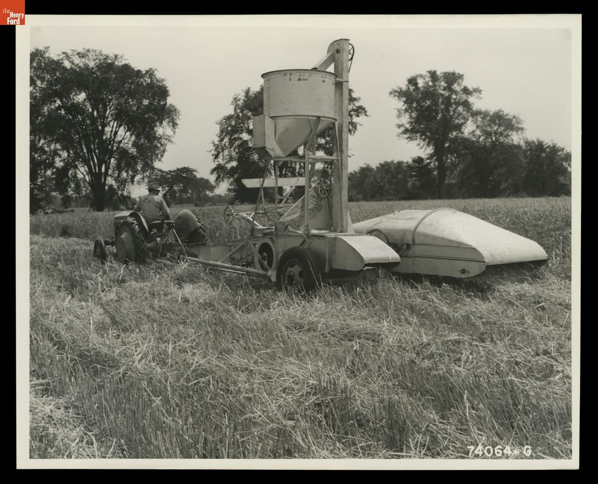 Ford Motor Company introduced the 9N tractor in 1939. It featured the "Ferguson System:" a 3-point hydraulic hitch-and-lift system invented by Irishman Harry Ferguson. Ferguson's revolutionary hitch kept agricultural implements, like the combine seen here, in line with the tractor. It also provided stability. By 1940, nearly 8 percent of tractors sold in the U.S. were 9Ns.