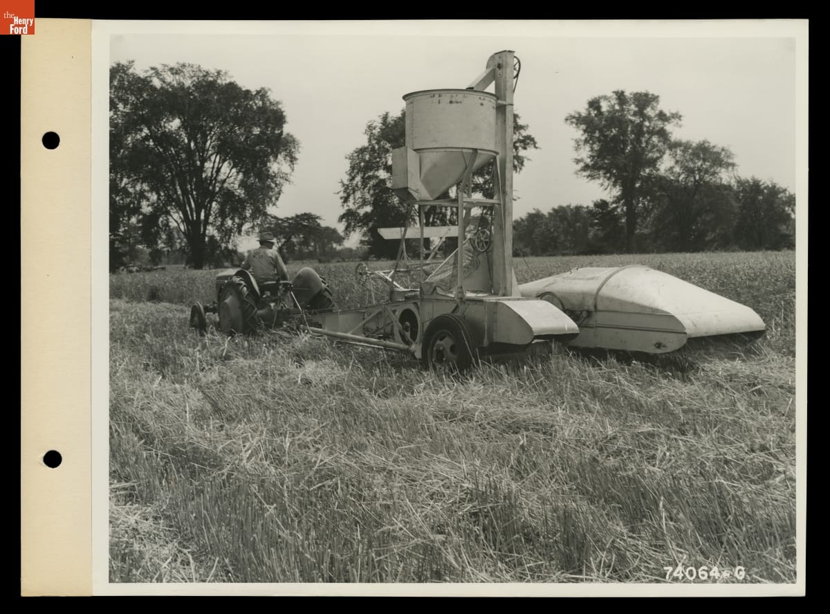 Man Driving a Ford-Ferguson Tractor with Ferguson Combine Attached, August 1940