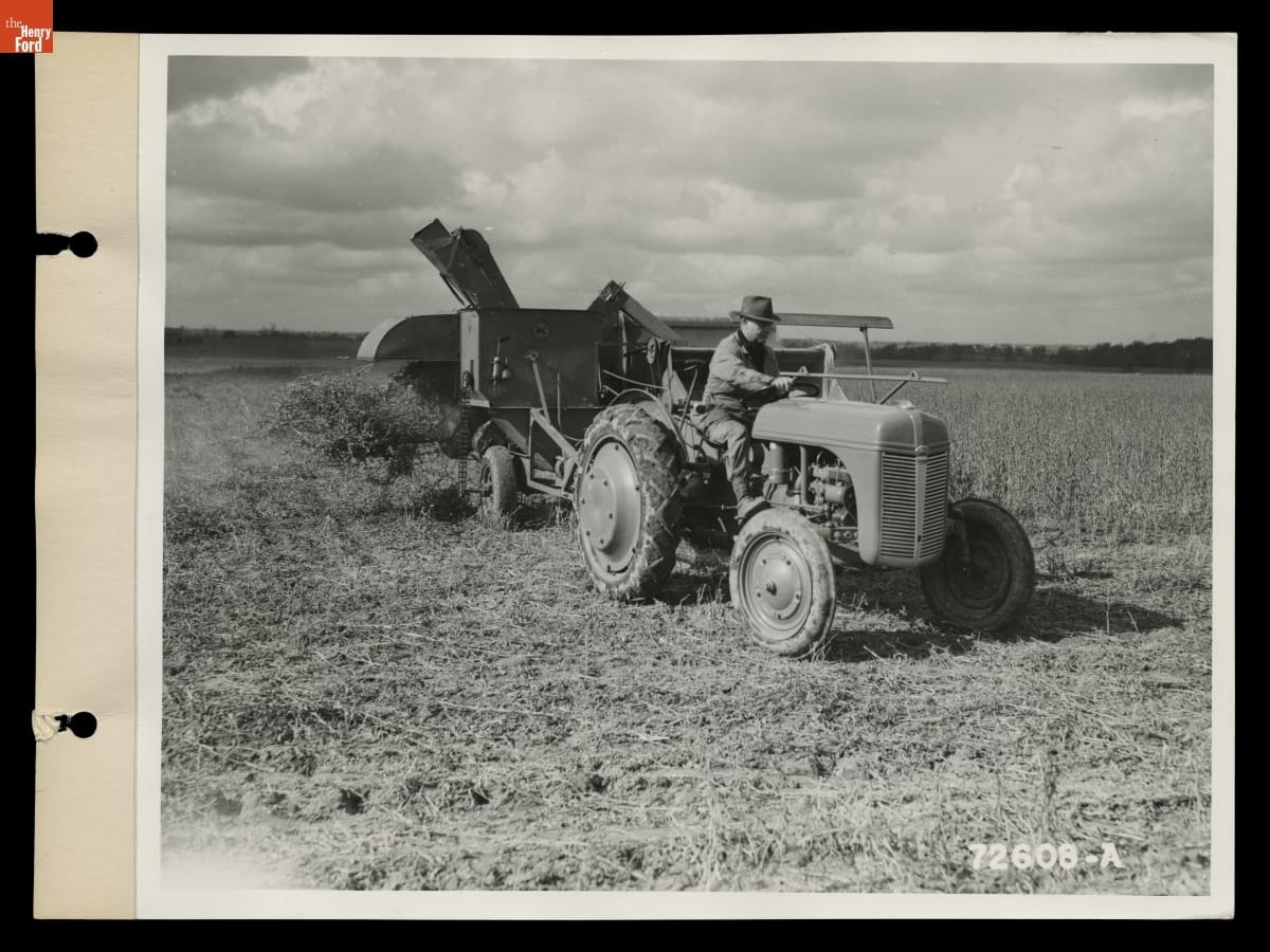 Henry Ford acquired thousands of acres of farmland in southeast Michigan, collectively known as the Ford Farms. Much of the Farms' acreage was dedicated to one of Ford's agricultural interests at that time: soybeans. This 1939 image shows a tractor-drawn combine harvesting soybeans in Macon, Michigan.