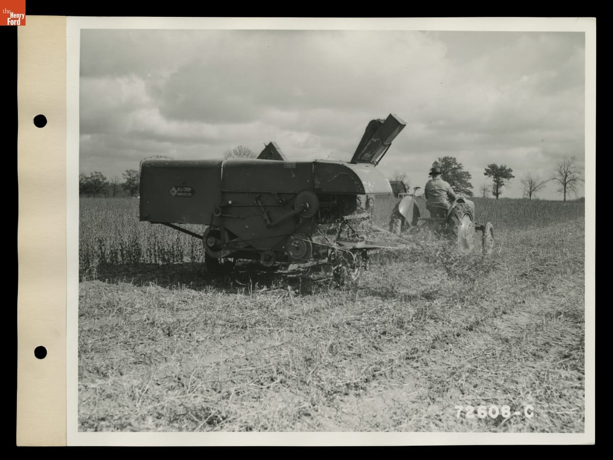 Henry Ford acquired thousands of acres of farmland in southeast Michigan, collectively known as the Ford Farms. Much of the Farms' acreage was dedicated to one of Ford's agricultural interests at that time: soybeans. This 1939 image shows a tractor-drawn combine harvesting soybeans in Macon, Michigan.