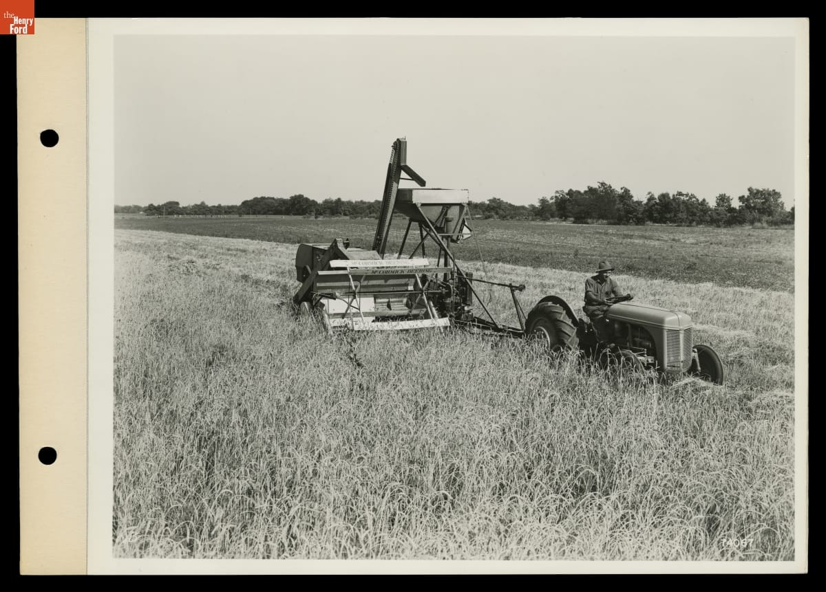 Ford Motor Company introduced the 9N tractor in 1939. It featured the "Ferguson System:" a 3-point hydraulic hitch-and-lift system invented by Irishman Harry Ferguson. Ferguson's revolutionary hitch kept agricultural implements, like the combine seen here, in line with the tractor. It also provided stability. By 1940, nearly 8 percent of tractors sold in the U.S. were 9Ns.