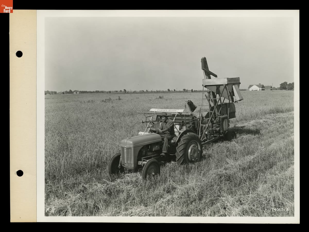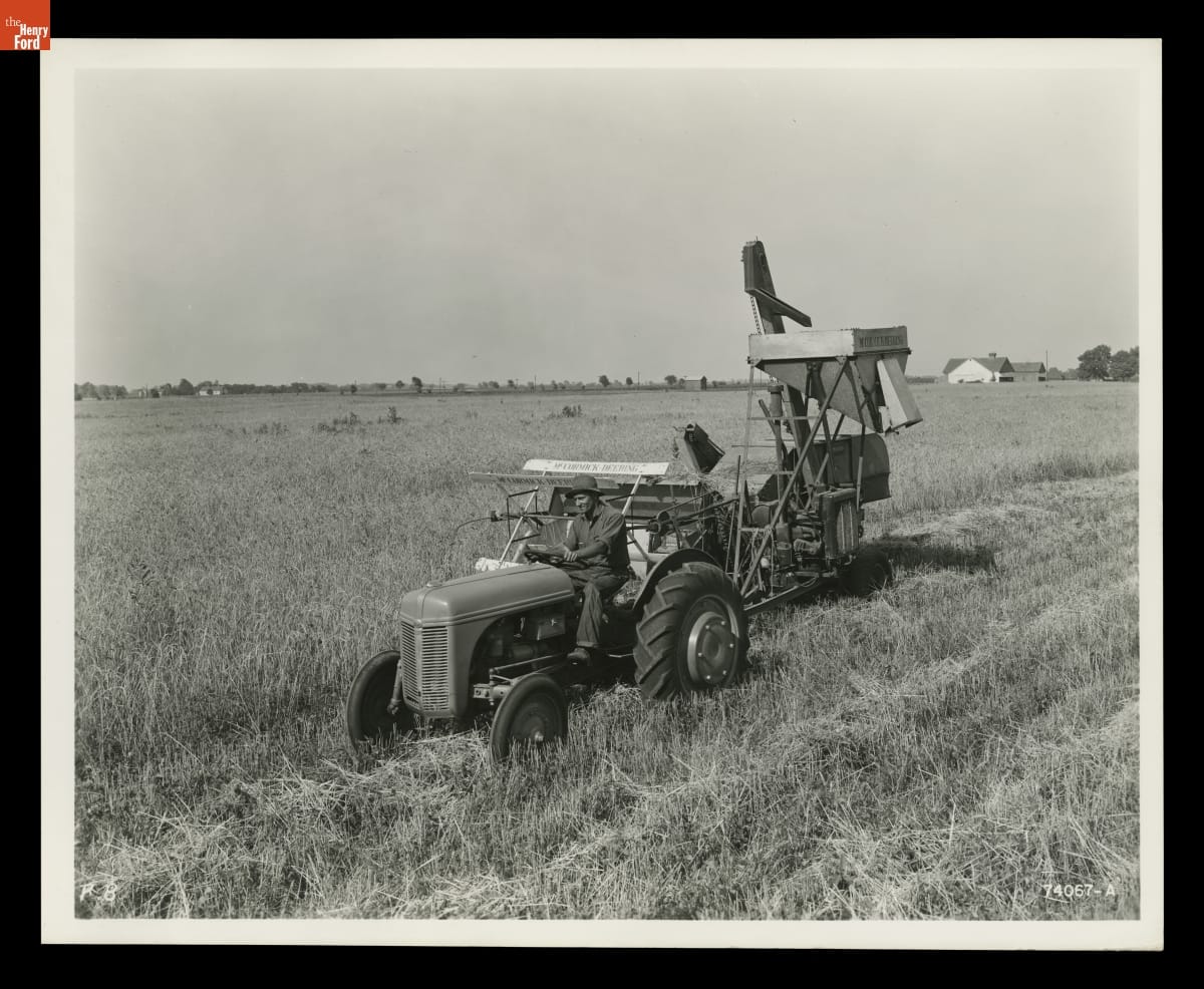 Ford Motor Company introduced the 9N tractor in 1939. It featured the "Ferguson System:" a 3-point hydraulic hitch-and-lift system invented by Irishman Harry Ferguson. Ferguson's revolutionary hitch kept agricultural implements, like the combine seen here, in line with the tractor. It also provided stability. By 1940, nearly 8 percent of tractors sold in the U.S. were 9Ns.