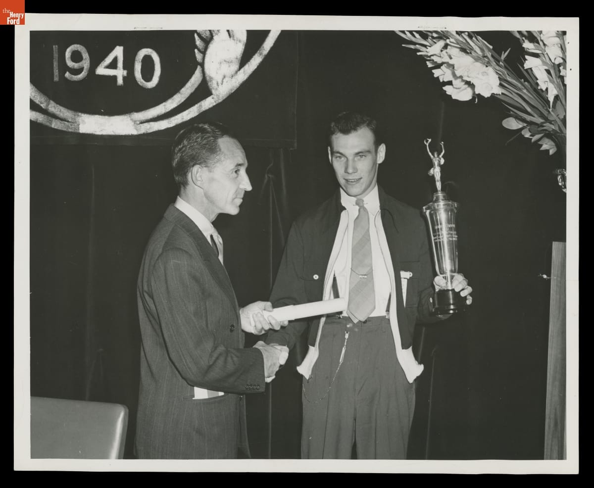Edsel Ford Awards a $5,000 Scholarship to Gene Kennard, the 1940 Ford Good Drivers League Champion Driver