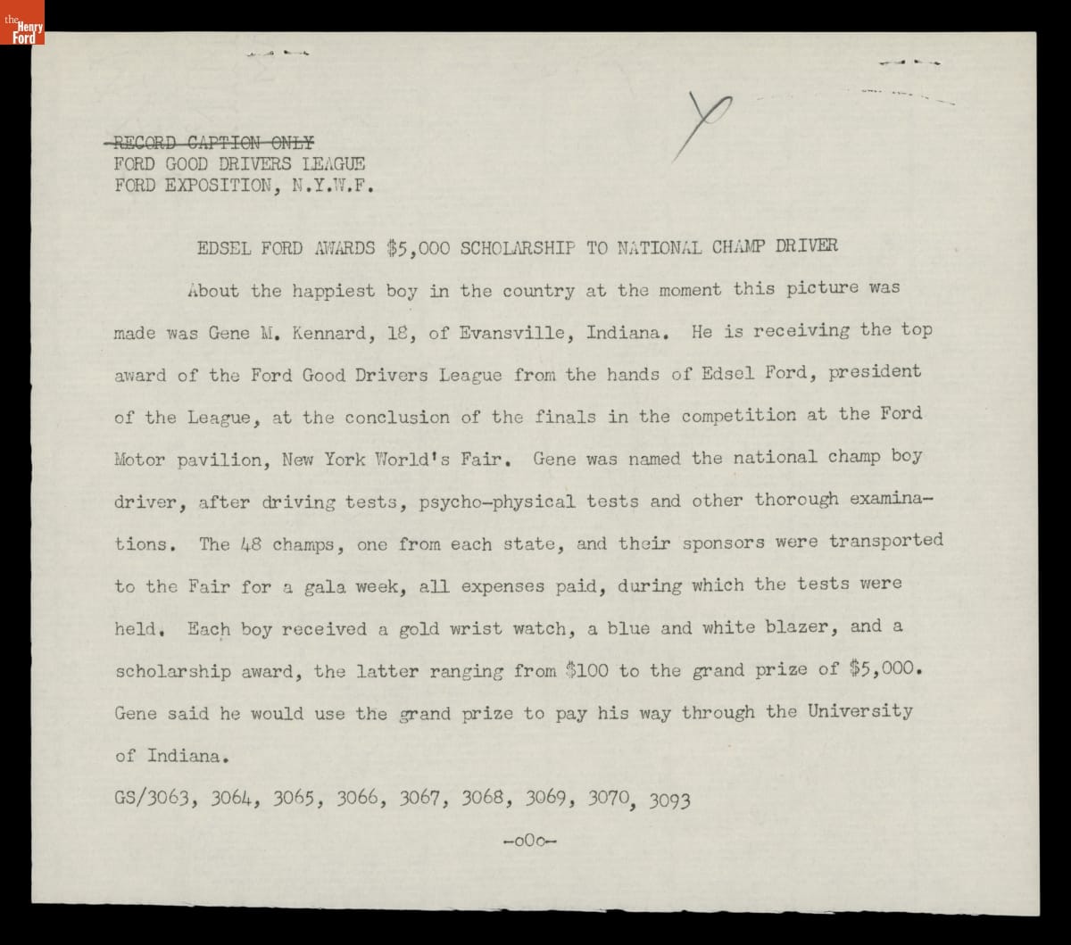 Ford Motor Company created the Good Drivers League in 1940 to promote safe driving habits among high school students. Boys from 48 states traveled to the New York World's Fair to compete in the national finals. After a week of testing, Gene Kennard of Evansville, Indiana, was chosen as the National Champion. Edsel Ford presented Gene with a trophy and a $5,000 scholarship.