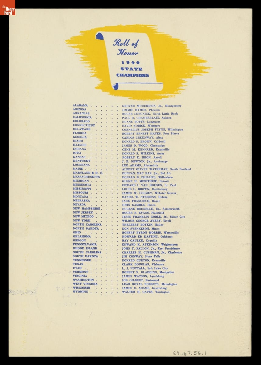 Ford Motor Company created the Good Drivers League in 1940. Headed by Edsel Ford, the League promoted safe driving habits among high school students. More than 60,000 boys competed for 48 university scholarships - ranging from $100 to $5,000 - during the program's first year. Top participants met at the 1940 New York World's Fair for final testing and an award ceremony.