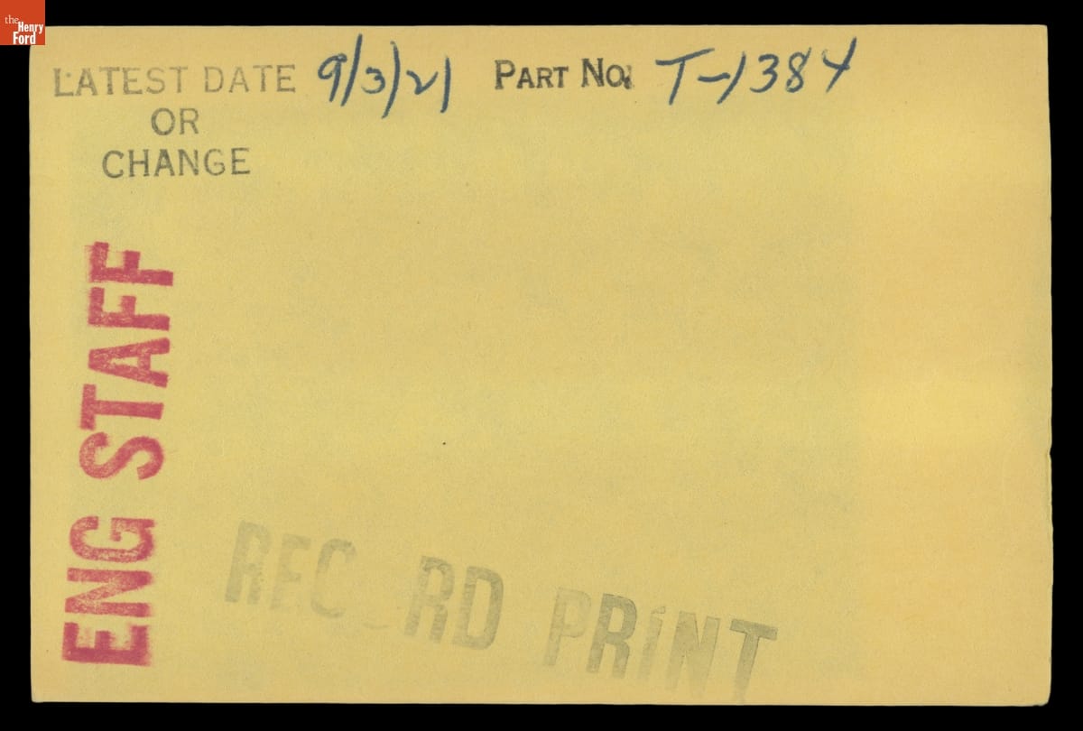 The Ford Motor Company created over a million parts drawings from 1903 to 1957. Many of these drawings specify engineering requirements for the components of Ford-made vehicles--including automobiles, trucks, tractors, military vehicles and Tri-motor airplanes. Others document assembly components, stages of casting and forging, or experimental designs. Beginning in the 1940s, Ford transferred the drawings to microfilm.