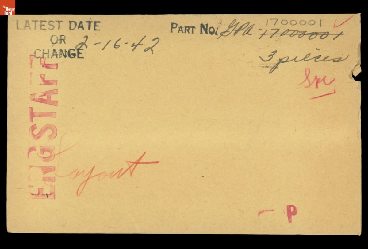 The Ford Motor Company created over a million parts drawings from 1903 to 1957. Many of these drawings specify engineering requirements for the components of Ford-made vehicles--including automobiles, trucks, tractors, military vehicles and Tri-motor airplanes. Others document assembly components, stages of casting and forging, or experimental designs. Beginning in the 1940s, Ford transferred the drawings to microfilm.