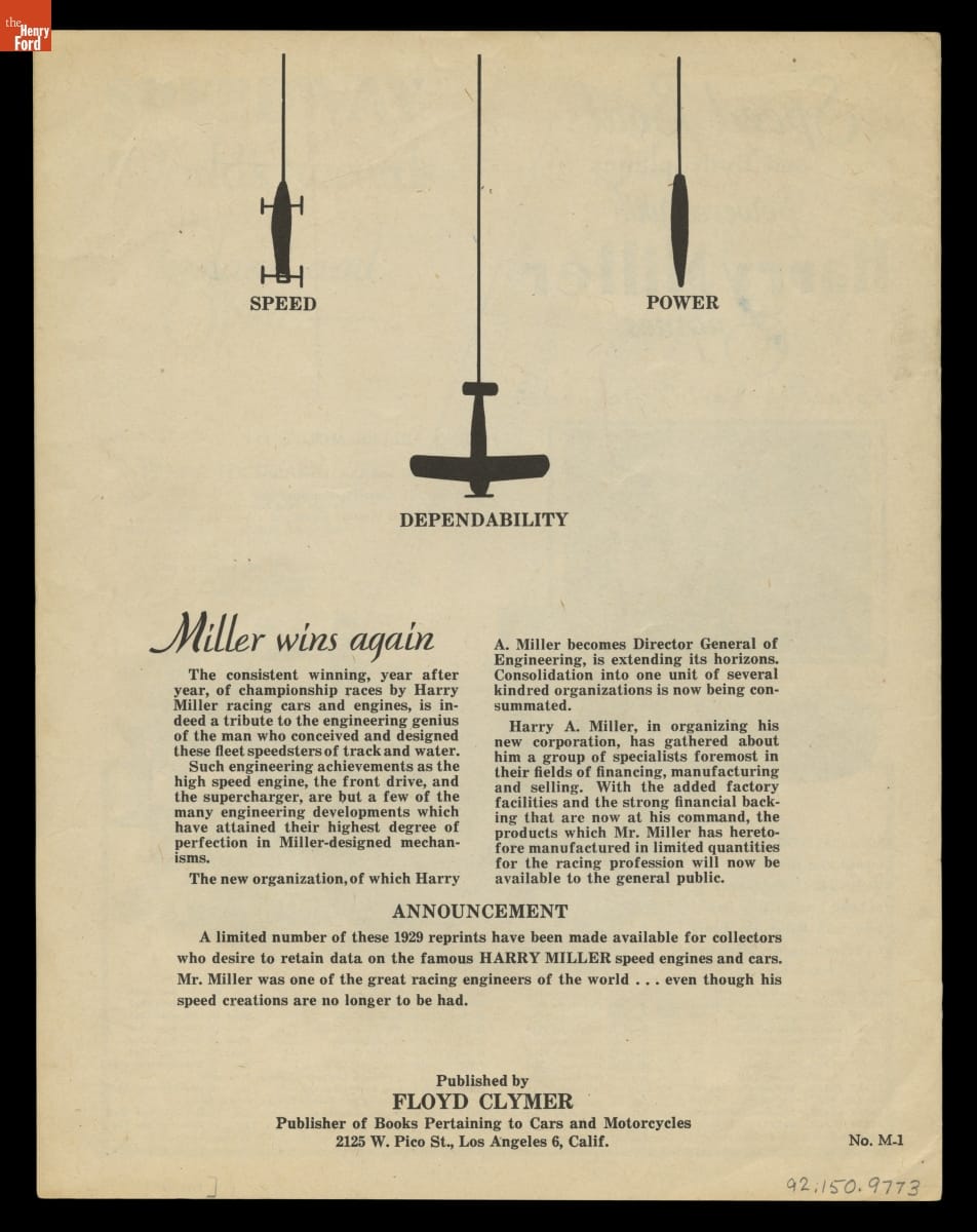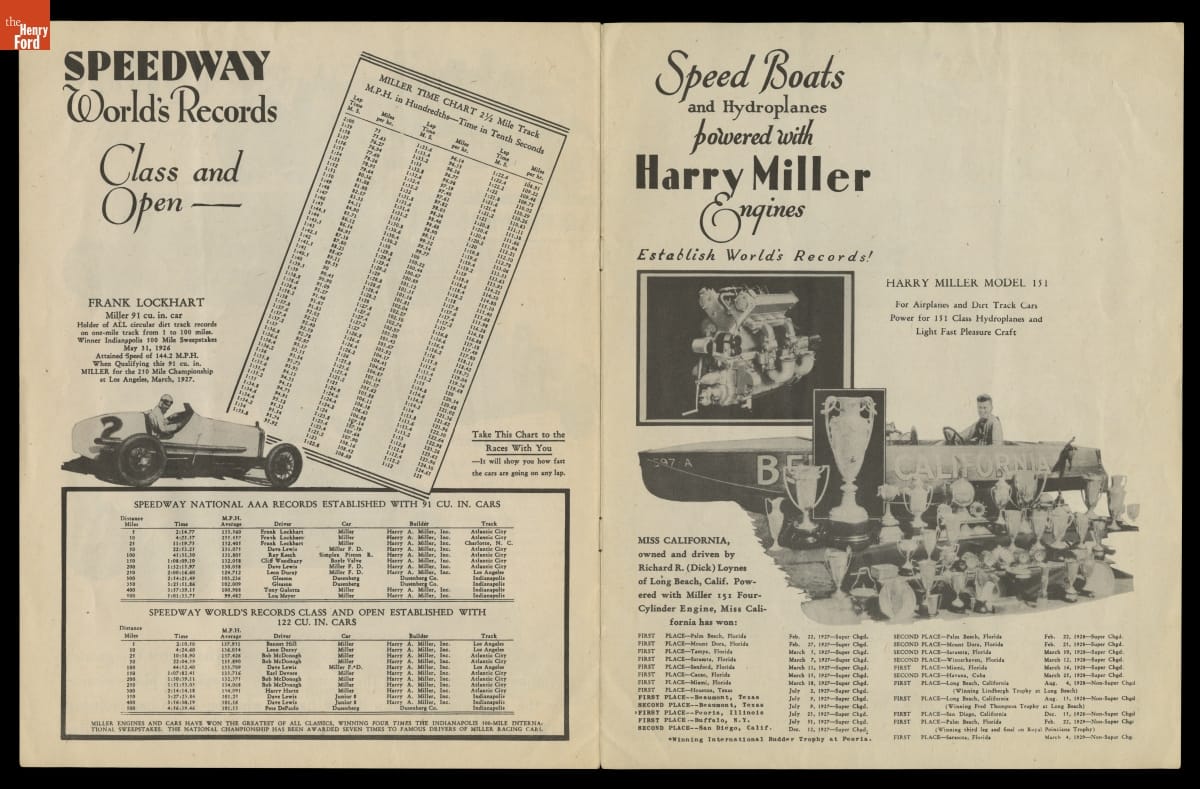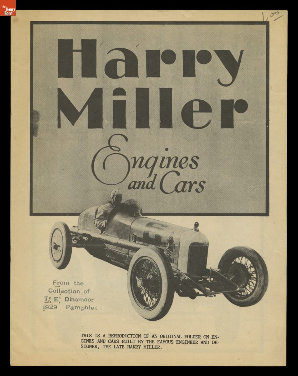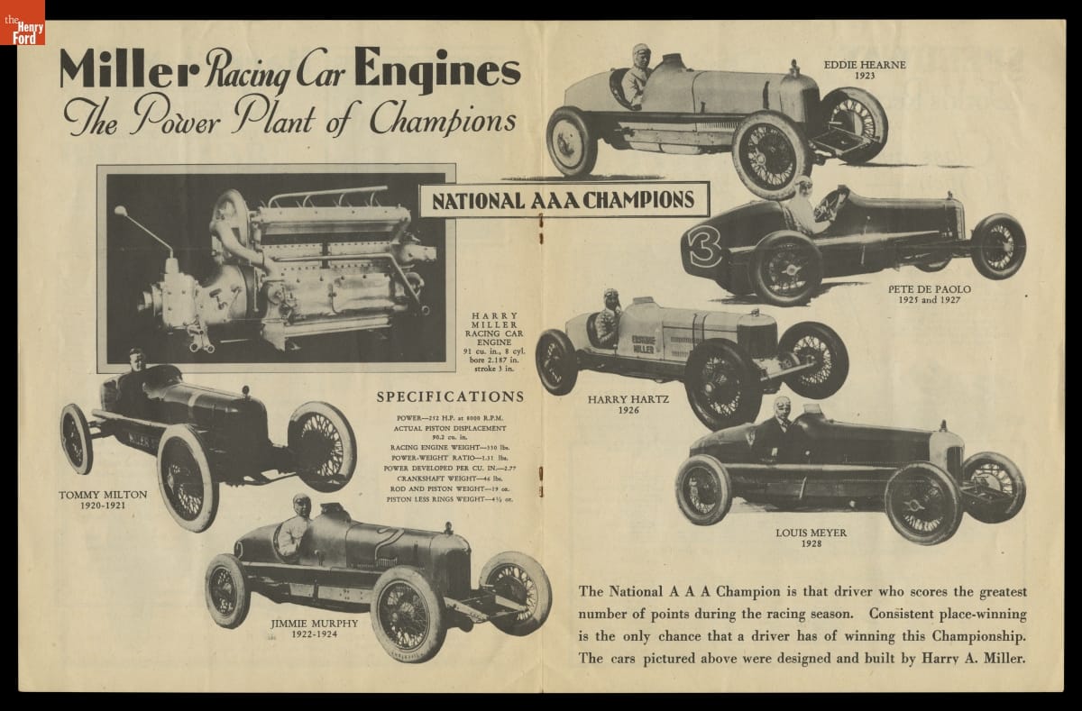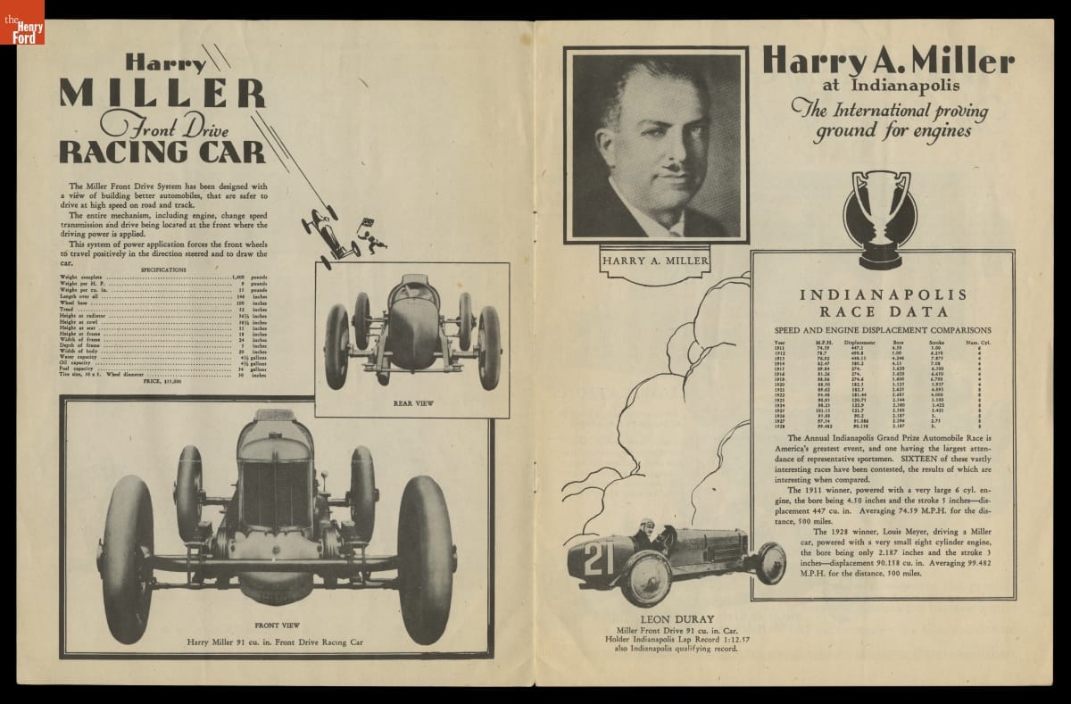Designer Harry Miller was one of the most influential figures in early American auto racing. He pioneered the use of front- and four-wheel-drive chassis, lightweight metals, and supercharged engines. Miller's innovative automobiles and engines dominated the Indianapolis 500 in the 1920s and 1930s. Miller-designed cars or engines won the race 14 times from 1922 to 1938.