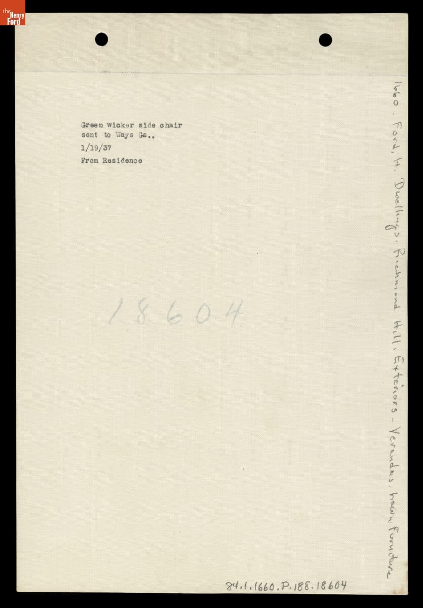 Lawn Chair Sent to Henry and Clara Ford's Richmond Hill Estate, 1937