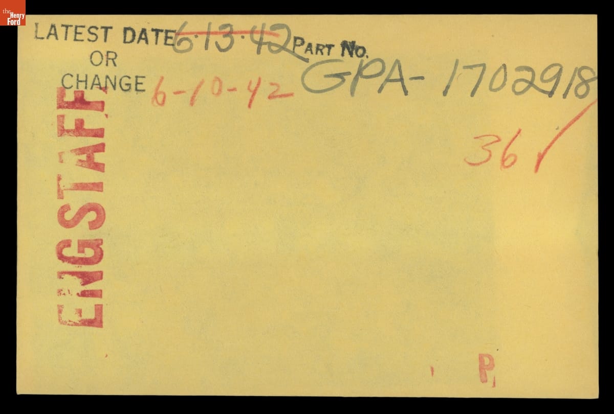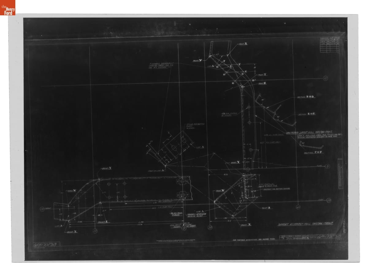 The Ford Motor Company created over a million parts drawings from 1903 to 1957. Many of these drawings specify engineering requirements for the components of Ford-made vehicles--including automobiles, trucks, tractors, military vehicles and Tri-motor airplanes. Others document assembly components, stages of casting and forging, or experimental designs. Beginning in the 1940s, Ford transferred the drawings to microfilm.