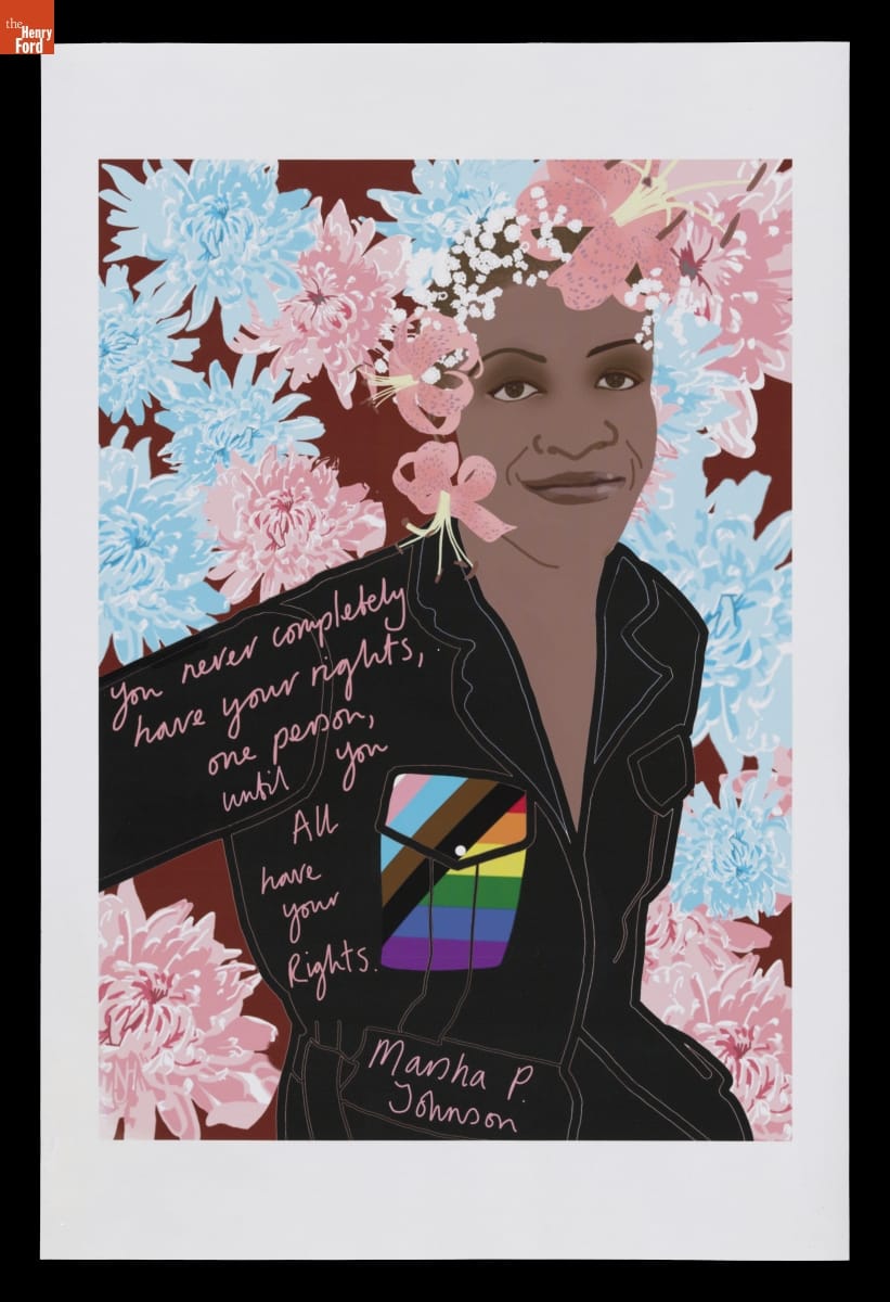 Marsha P. Johnson -- a drag performer and self-identified transvestite (the word “transgender” was not widely used in her lifetime) -- was a tireless advocate for gay rights. This print, featuring a quote from Johnson, honors the intersectional legacies of Black LGBTQ+ leaders, as well as Daniel Quasar's redesign of the Pride Flag to include stripes for BIPOC and trans people.
