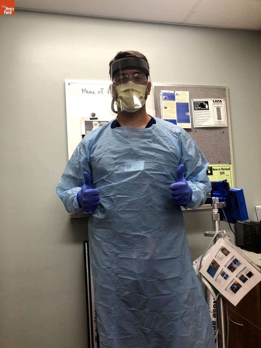 Zach White Wearing COVID-19-Protective Clothing and Equipment over Scrubs in a Medical Clinic, August 13, 2020