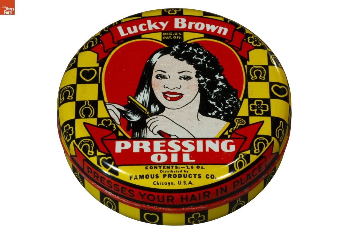 Lucky Brown / REG. U.S. / PAT. OFF. / PRESSING / OIL / CONTENTS:--1.6 Oz. / Distributed by / FAMOUS PRODUCTS CO., / Chicago, U.S.A.