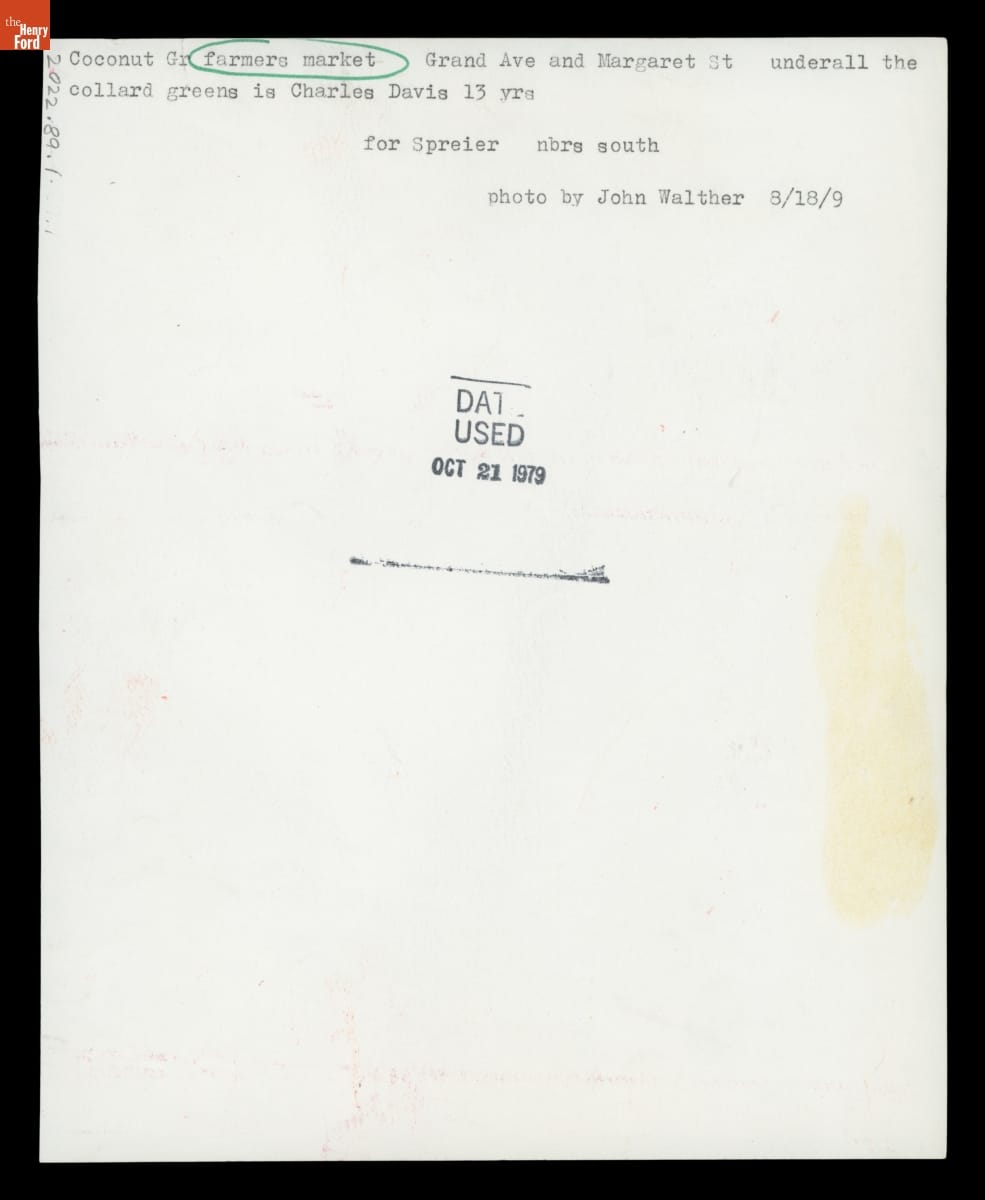 on back: Coconut Gr farmers market Grand Ave and Margaret St underall the / collard greens is Charles Davis 13 years