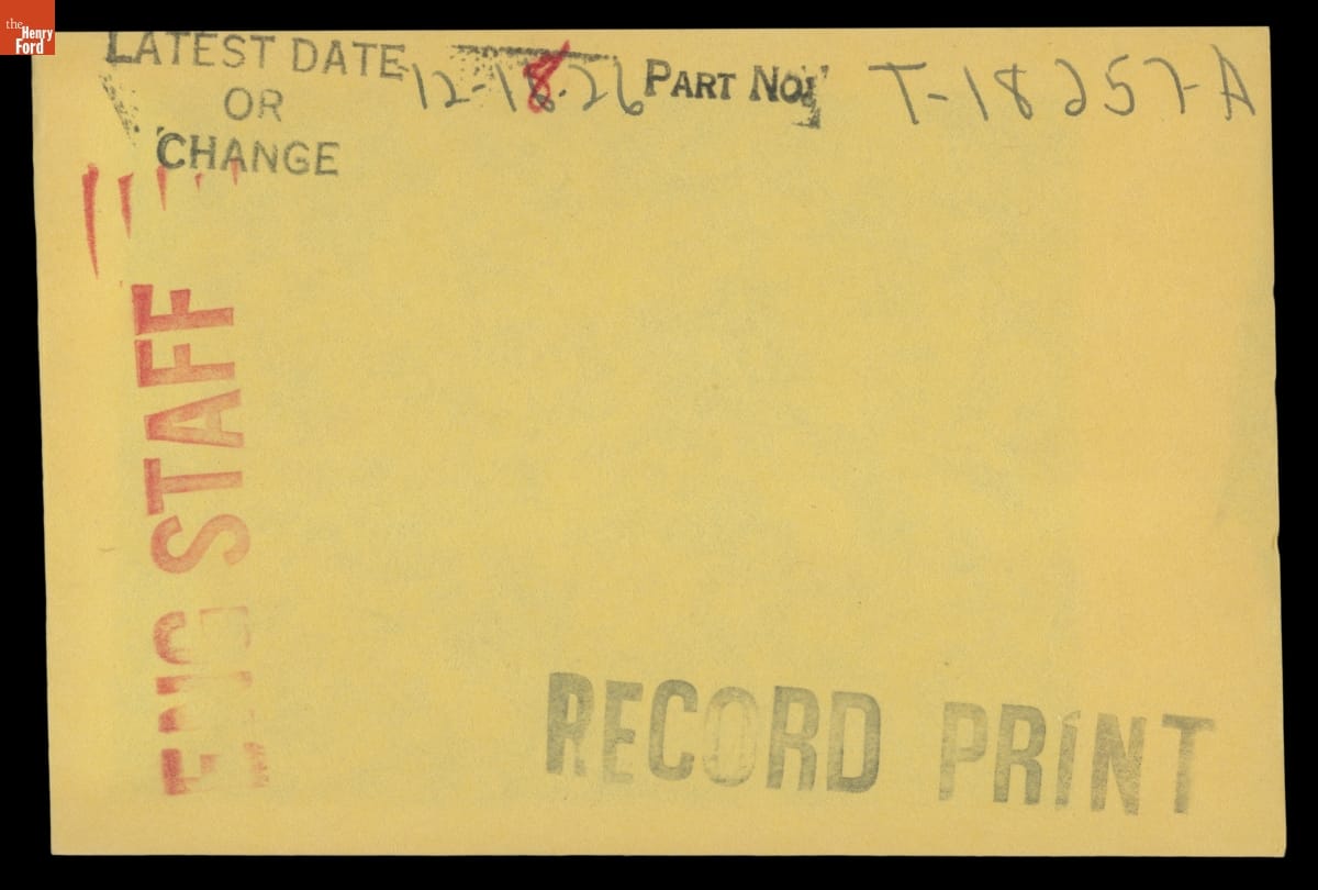 The Ford Motor Company created over a million parts drawings from 1903 to 1957. Many of these drawings specify engineering requirements for the components of Ford-made vehicles--including automobiles, trucks, tractors, military vehicles and Tri-motor airplanes. Others document assembly components, stages of casting and forging, or experimental designs. Beginning in the 1940s, Ford transferred the drawings to microfilm.