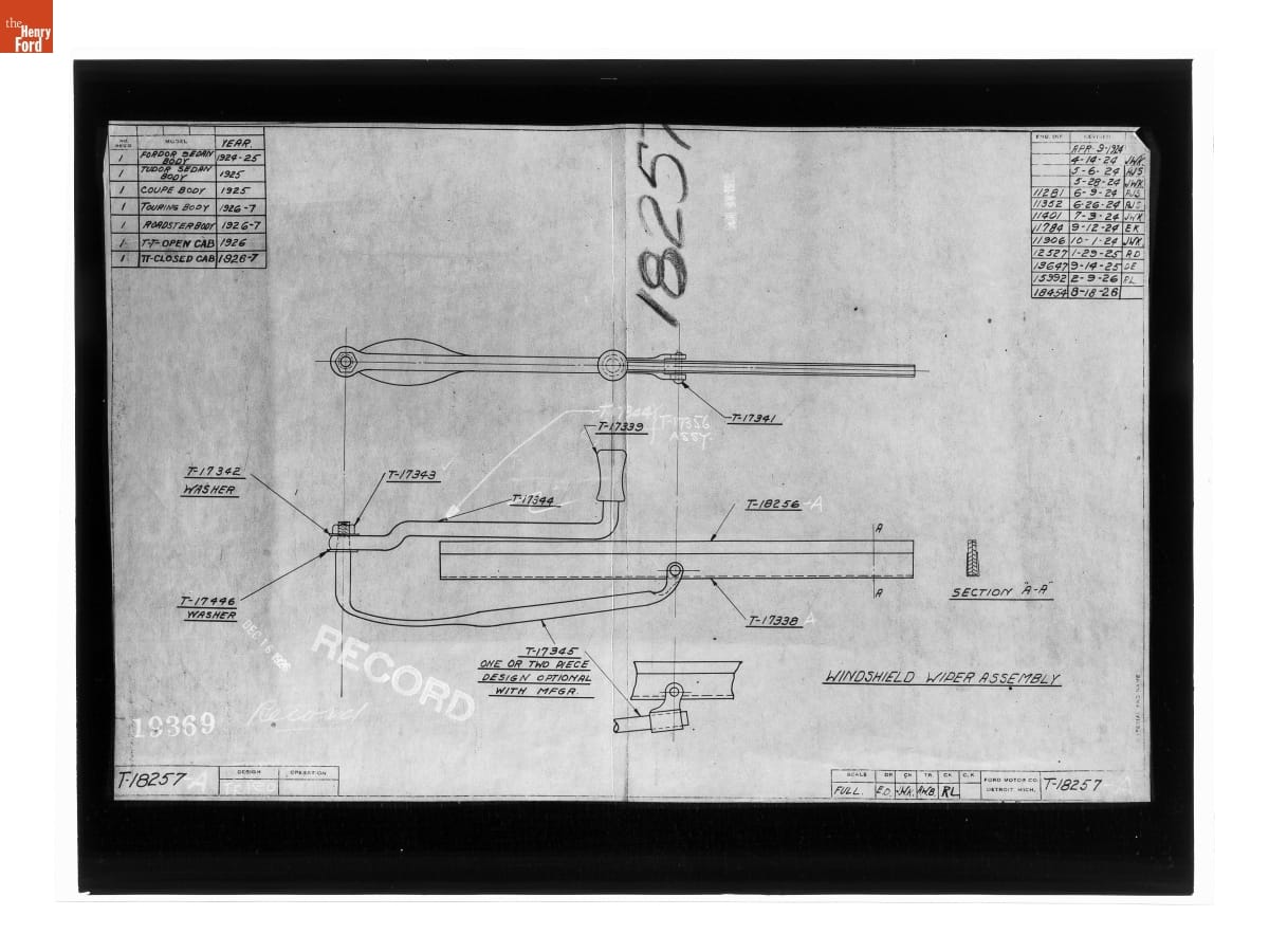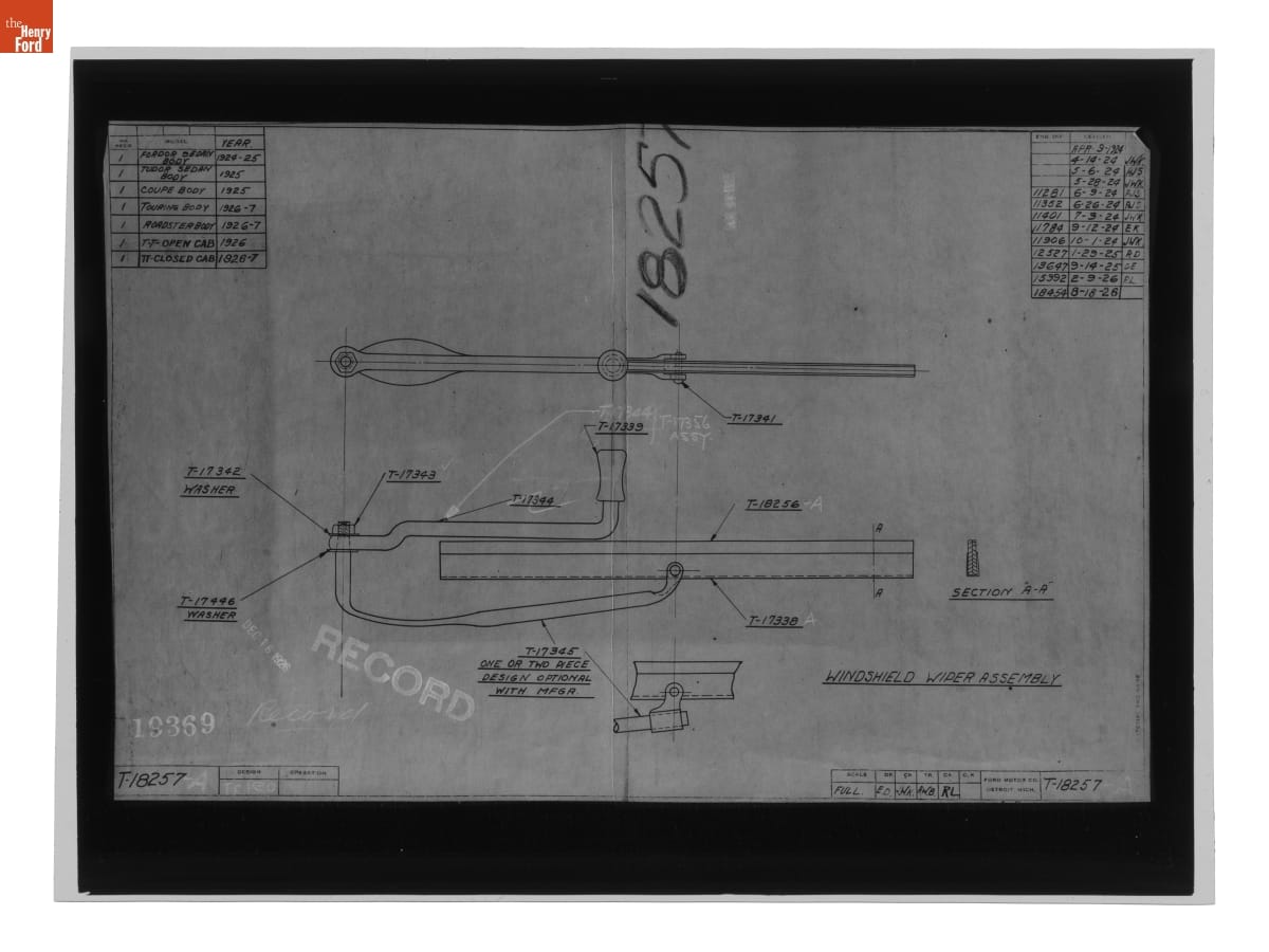 Drawing, "Windshield Wiper Assembly," Ford Model T, August 18, 1926