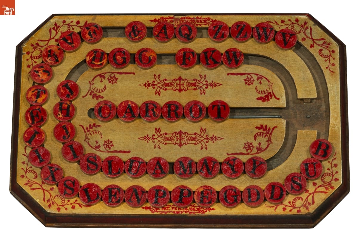 Combining learning with play, the Universal Spelling Board, patented in 1886, helped develop motor skills and teach children letters and spelling. It challenged users to locate circular letter tiles on a slotted track, then slide them to complete words in the center.