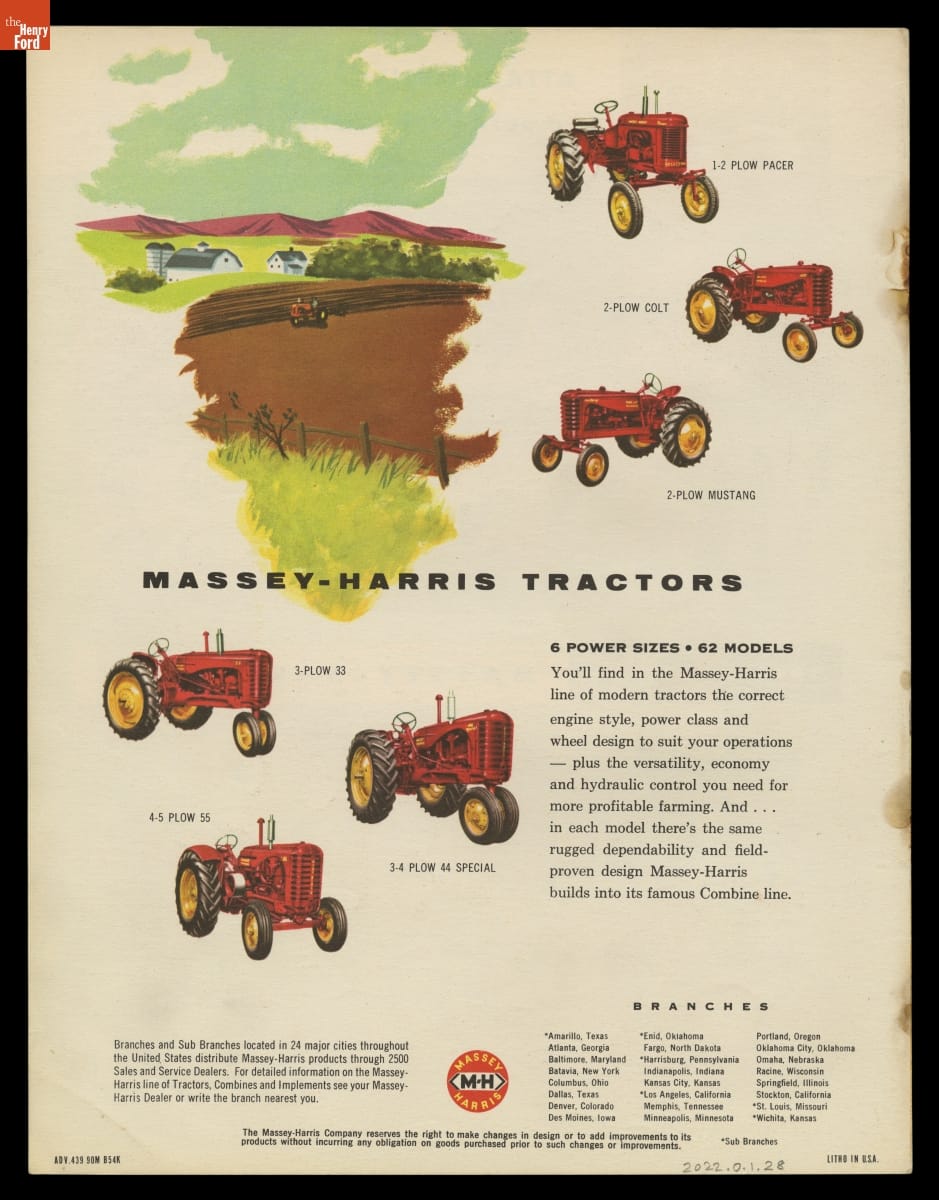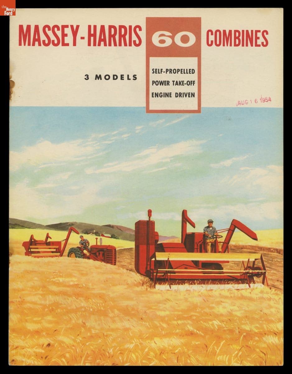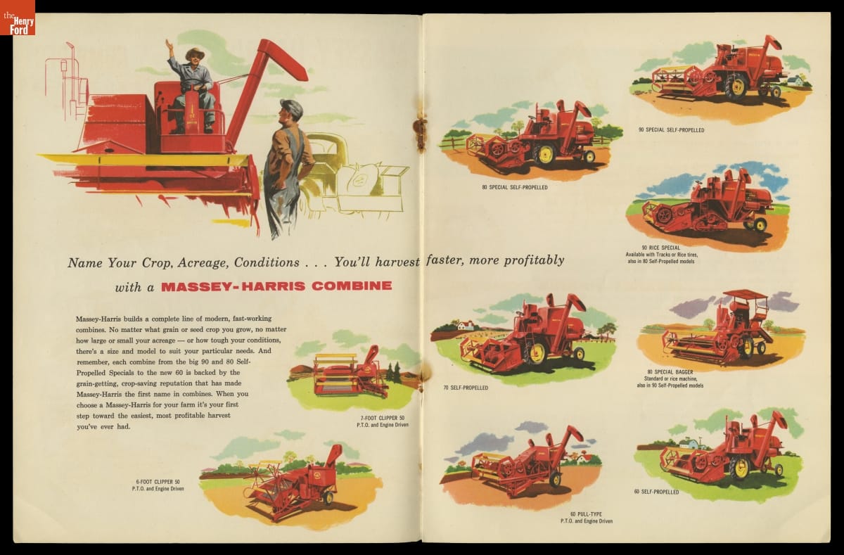 For centuries, manufacturers worked to perfect machinery that could combine the three major steps of harvesting grain: reaping, or cutting the crop; threshing to loosen the grain from the chaff; and disposing of the straw while retaining the grain. Massey-Harris introduced self-propelled combines in 1938 that helped relieve labor shortages during World War II. This catalog advertised Massey-Harris combines to meet postwar farmers' wide-ranging needs.