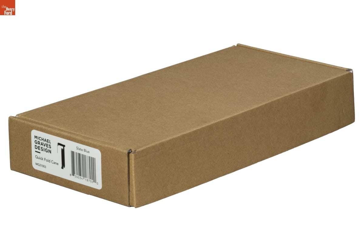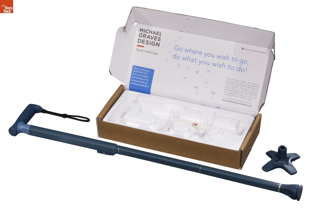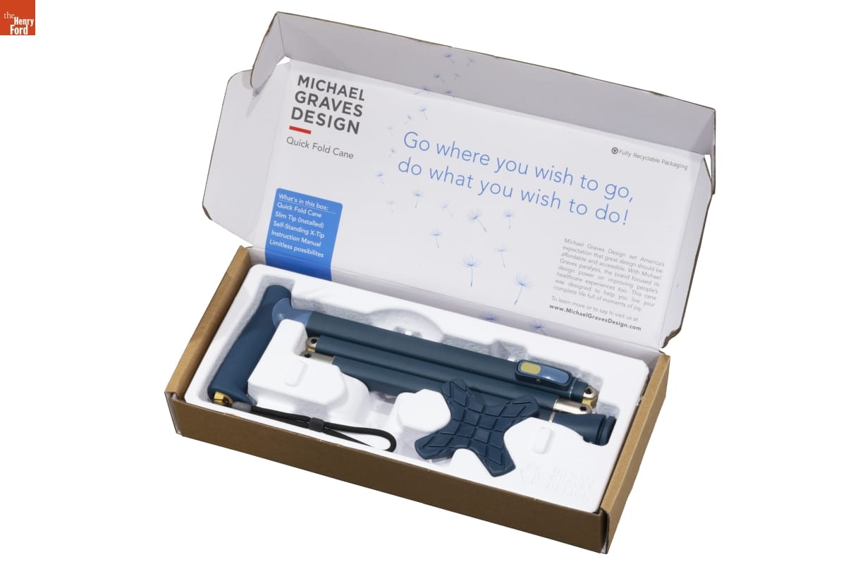 on right side of handle of cane: MICHAEL / GRAVES / DESIGN on right side of bottom of cane, near foot: China on front of one point foot: MICHAEL / GRAVES / DESIGN on top of X foot: MICHAEL / GRAVES / DESIGN on right side of packaging: MICHAEL / GRAVES / DESIGN / Quick Fold Cane / MG21003 / Slate Blue inside lid of packaging: MICHAEL / GRAVES / DESIGN / Quick Fold Cane / Fully Recycleable Packaging / Go where you wish to go, / do what you wish to do! / Michael Graves Design set America's / expectation that great design should be / affordable and accessible. With Michael / Graves paralysis, the brand focused its / design power on improving people's / healthcare experiences too. This cane / was designed to help you live your / complete life full of momemnts of joy. / To learn more or to say hi visit us at: / www.MichaelGravesDesign.com/ What's in this box: / Quick Fold Cane / Slim Tip (installed) / Self-Standing X-Tip / Instruction Manual / Limitless possibilities on cardboard insert in bottom of packaging: MICHAEL / GRAVES / DESIGN sticker on bottom of cardboard insert on bottom of packaging: this product contains magnets which may / interfere with pacemakers, defibrillators, or / other medical devices. See user manual.