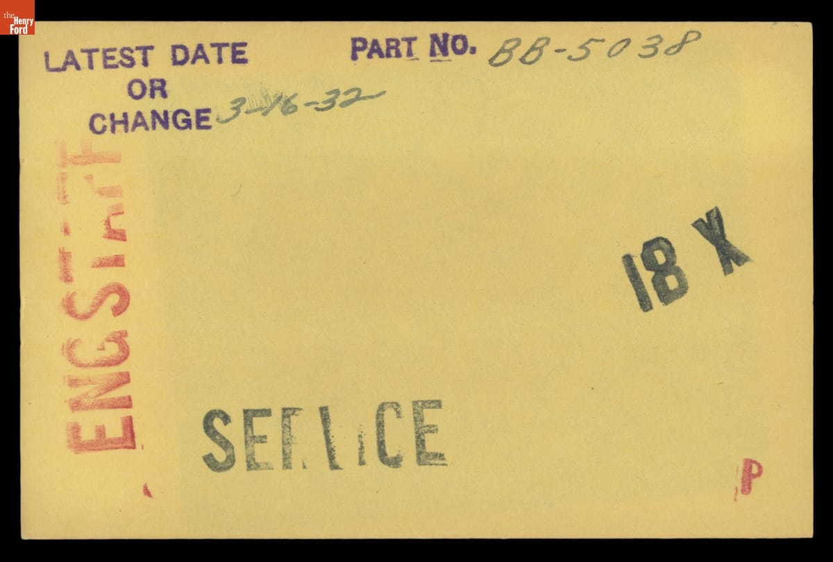 The Ford Motor Company created over a million parts drawings from 1903 to 1957. Many of these drawings specify engineering requirements for the components of Ford-made vehicles--including automobiles, trucks, tractors, military vehicles and Tri-motor airplanes. Others document assembly components, stages of casting and forging, or experimental designs. Beginning in the 1940s, Ford transferred the drawings to microfilm.