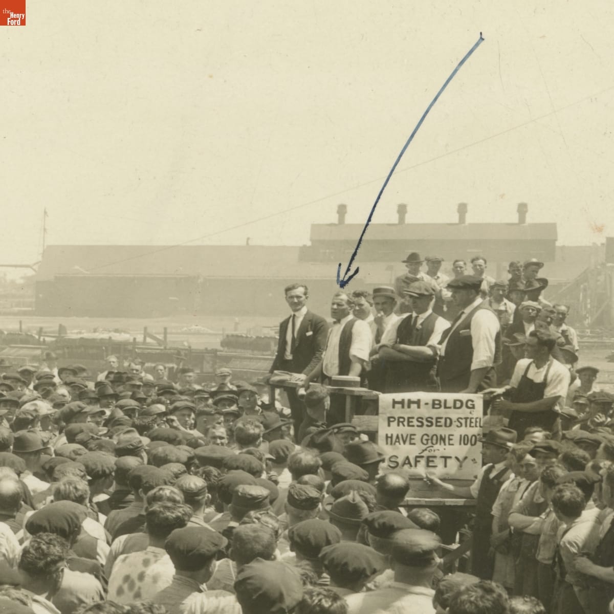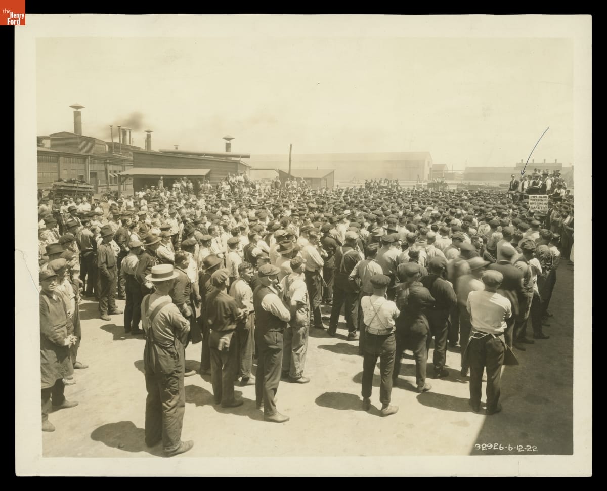 Employees outside the Pressed Steel Building at the Ford Motor Company Rouge Plant, June 1922