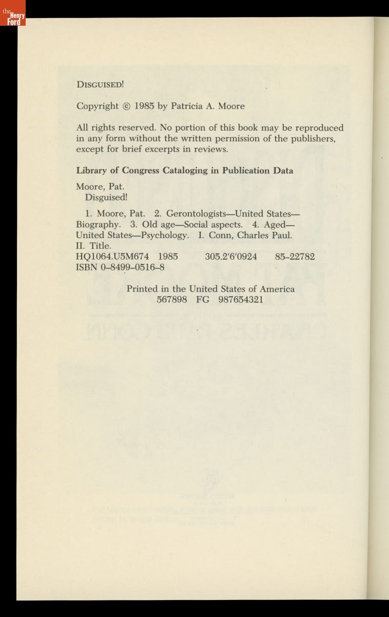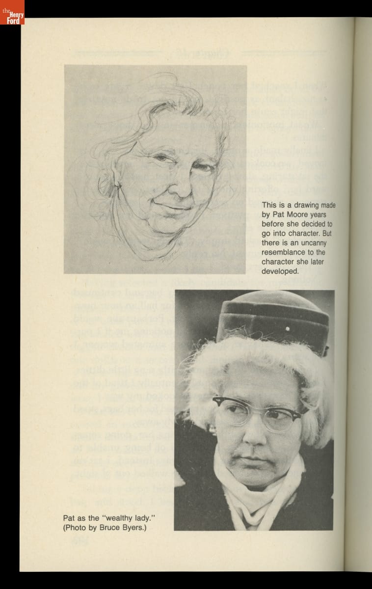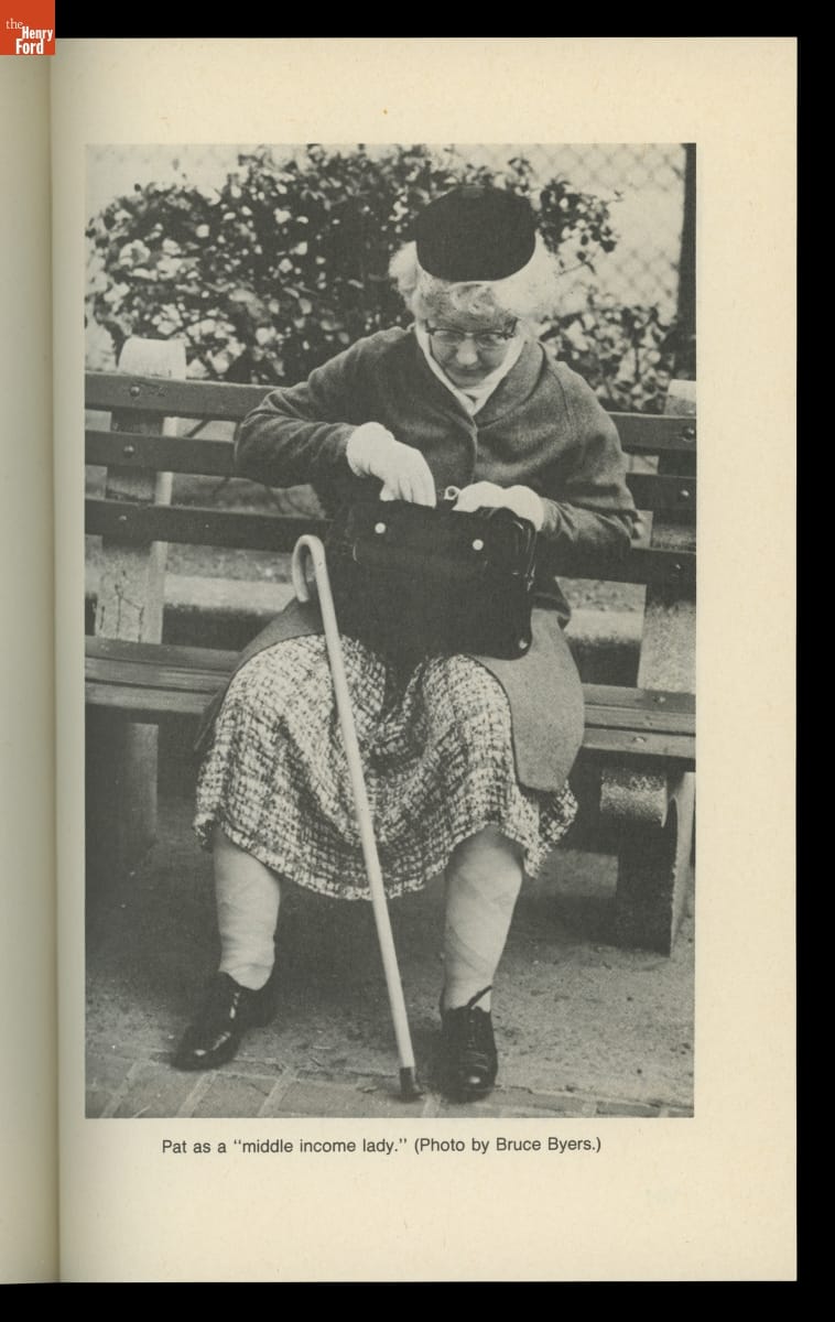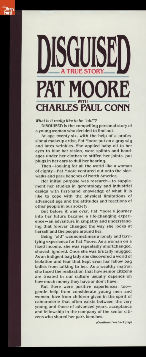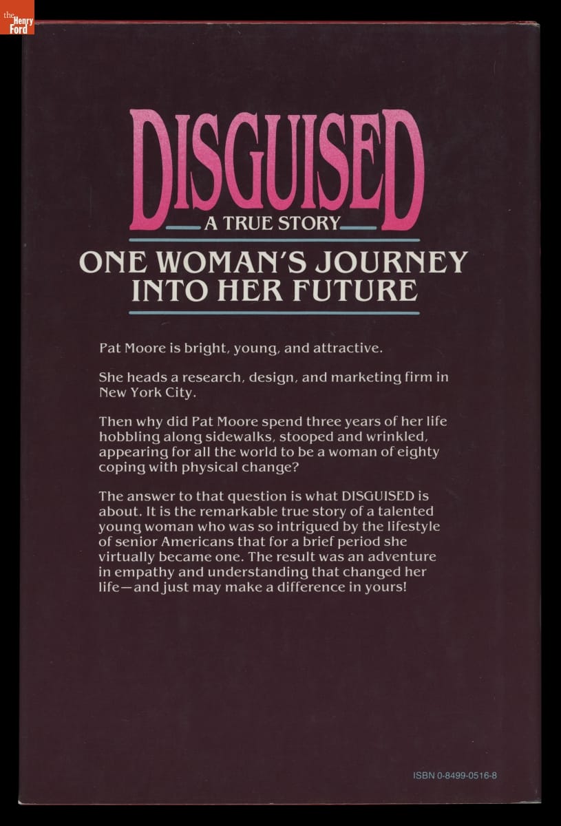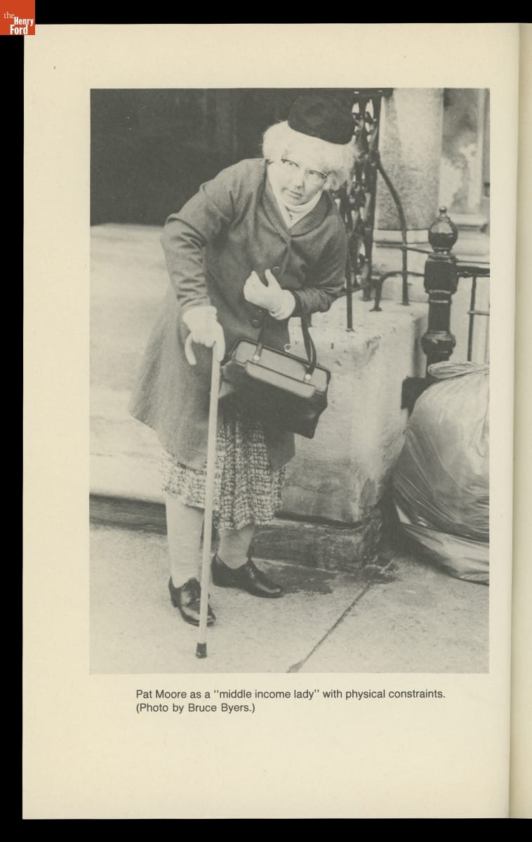 As a young industrial designer, Patricia Moore often pushed her superiors to design more accessibly. Looking to understand the challenges of an elderly person, Moore employed a professional makeup artist and transformed herself into an eighty-year-old woman using a latex mask and custom prosthetics. She then went out into the world. Later, she wrote about her experiences in her book Disguised!