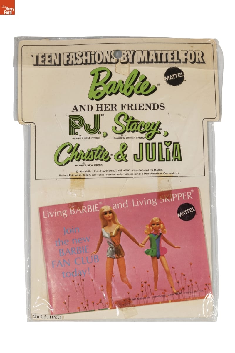 TEEN FASHiONS BY MATTEL FOR / Barbie (R) MATTEL TM / AND HER FRIENDS / P.J. TM / BARBIE'S BEST FRIEND / Stacey TM / BARBIE'S BRITISH FRIEND, / Christie TM / BARBIE'S NEW FRIEND / AND / JULIA / (C) 1969 Mattel, Inc., Hawthorne, Calif. 90250. Manufactured for Mattel. / Made & Printed in Japan. All rights reserved under International & Pan-American Conventions.