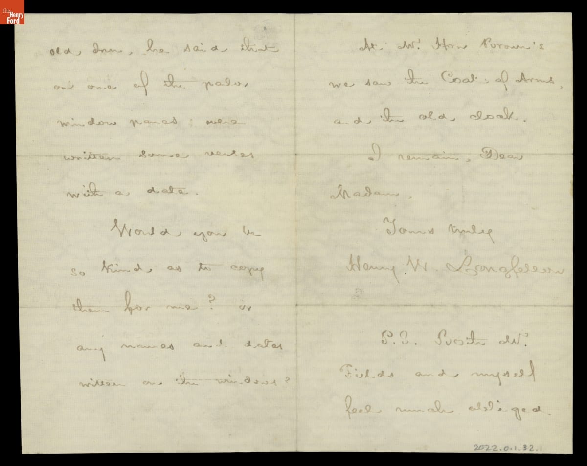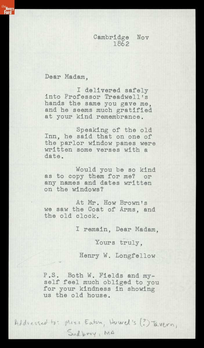 Henry Wadsworth Longfellow (1807-1882), the most beloved American poet of the 19th century, assembled a collection of his poetry into the book Tales of a Wayside Inn. The book recounts tavern guests entertaining each other during a storm by telling stories. Before the book's publication, Longfellow wrote Miss Eaton at Howe's Tavern--the original name of the Wayside Inn--inquiring about inscriptions found on the Inn's windowpanes.