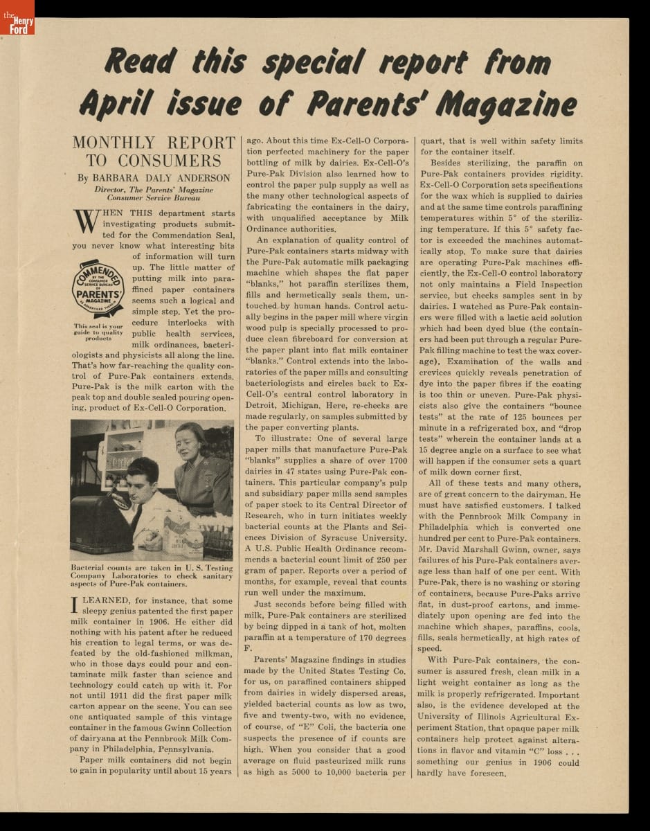 Reprinted Article about Paper Milk Cartons from Parents Magazine, April 1951