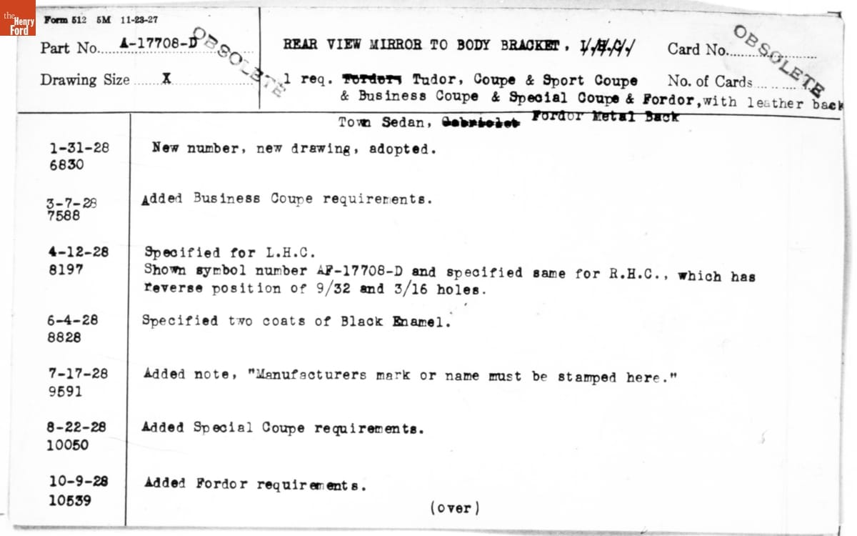 Engineering Release Notes, Rear View Mirror to Body Bracket, Ford Model A, 1928-1929