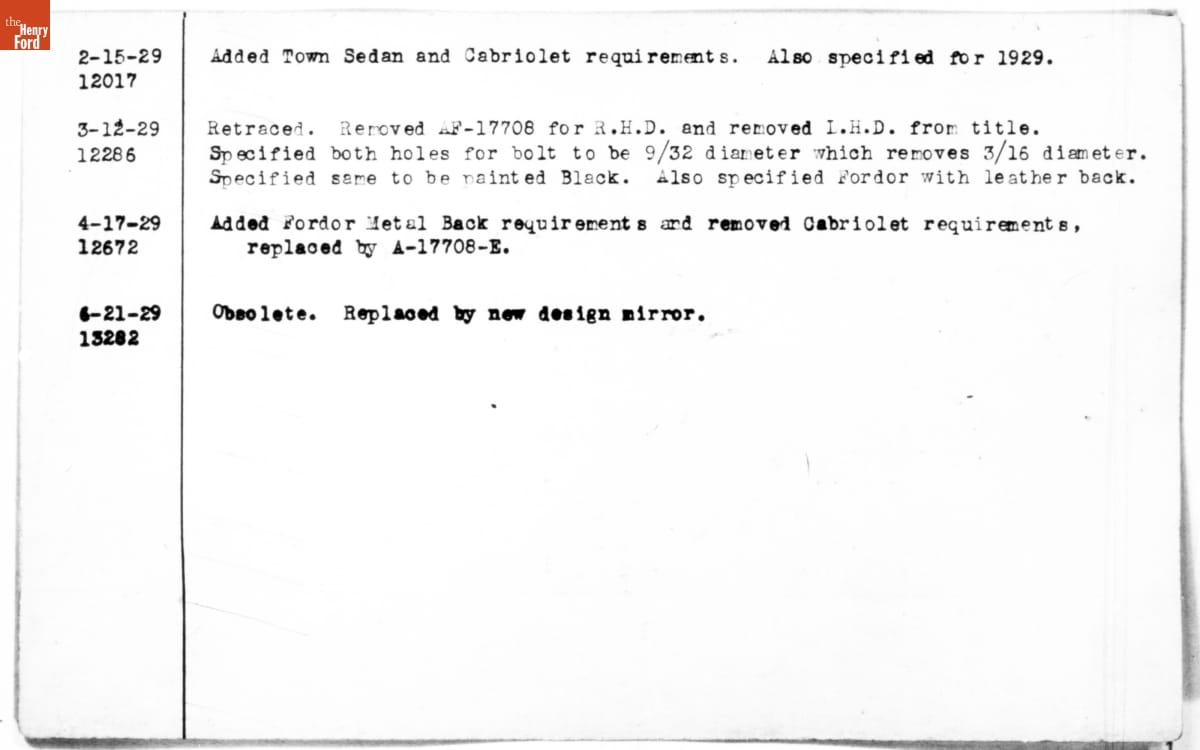 The Ford Motor Company created over a million parts drawings from 1903 to 1957. Many of these drawings specify engineering requirements for the components of Ford-made vehicles--including automobiles, trucks, tractors, military vehicles, and Tri-motor airplanes. Others provided information about assembly components, stages of casting and forging, or experimental designs. Beginning in the 1940s, Ford transferred the drawings and associated documents to microfilm.