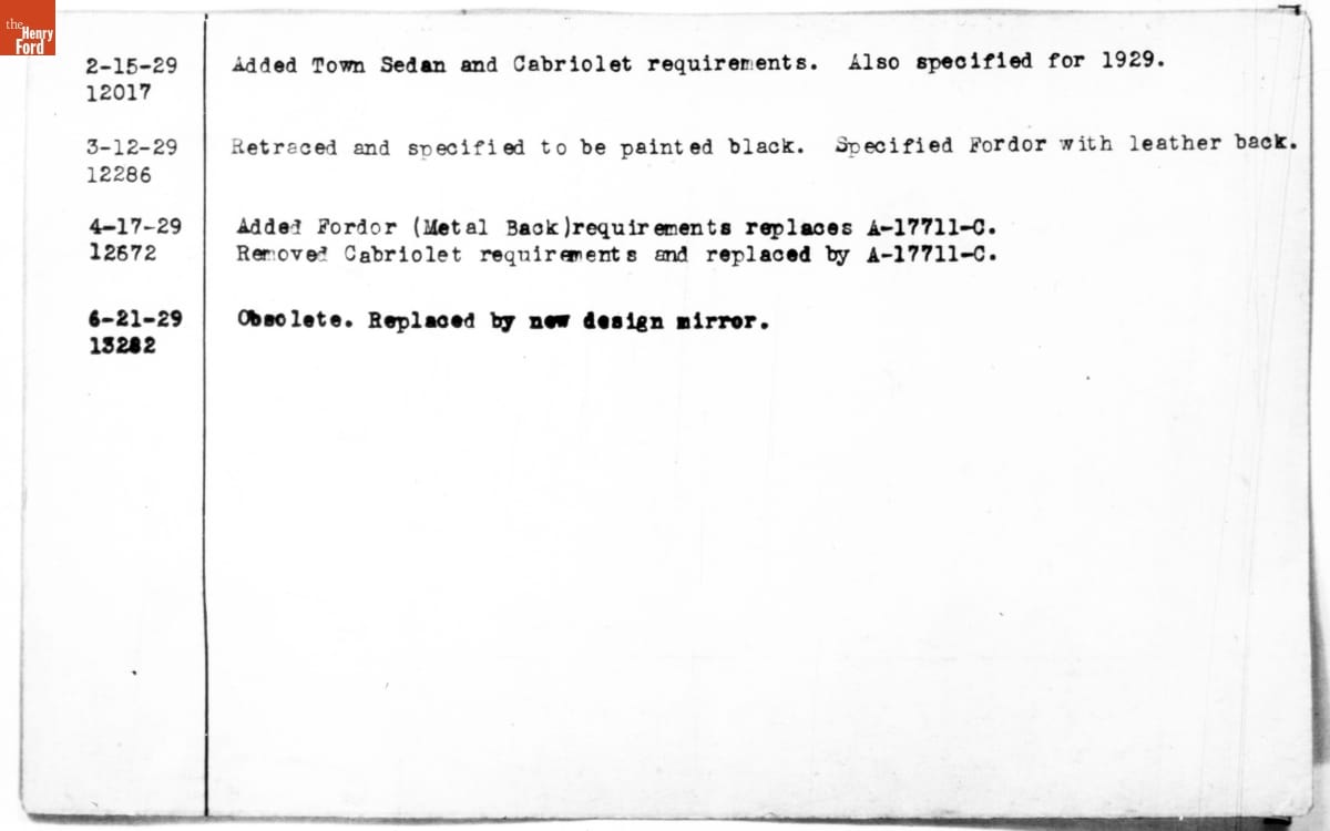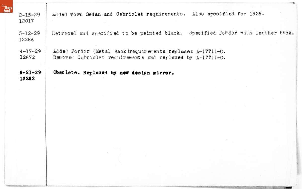 The Ford Motor Company created over a million parts drawings from 1903 to 1957. Many of these drawings specify engineering requirements for the components of Ford-made vehicles--including automobiles, trucks, tractors, military vehicles, and Tri-motor airplanes. Others provided information about assembly components, stages of casting and forging, or experimental designs. Beginning in the 1940s, Ford transferred the drawings and associated documents to microfilm.