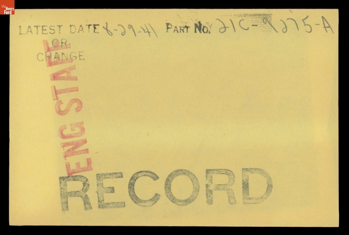 The Ford Motor Company created over a million parts drawings from 1903 to 1957. Many of these drawings specify engineering requirements for the components of Ford-made vehicles--including automobiles, trucks, tractors, military vehicles and Tri-motor airplanes. Others document assembly components, stages of casting and forging, or experimental designs. Beginning in the 1940s, Ford transferred the drawings to microfilm.