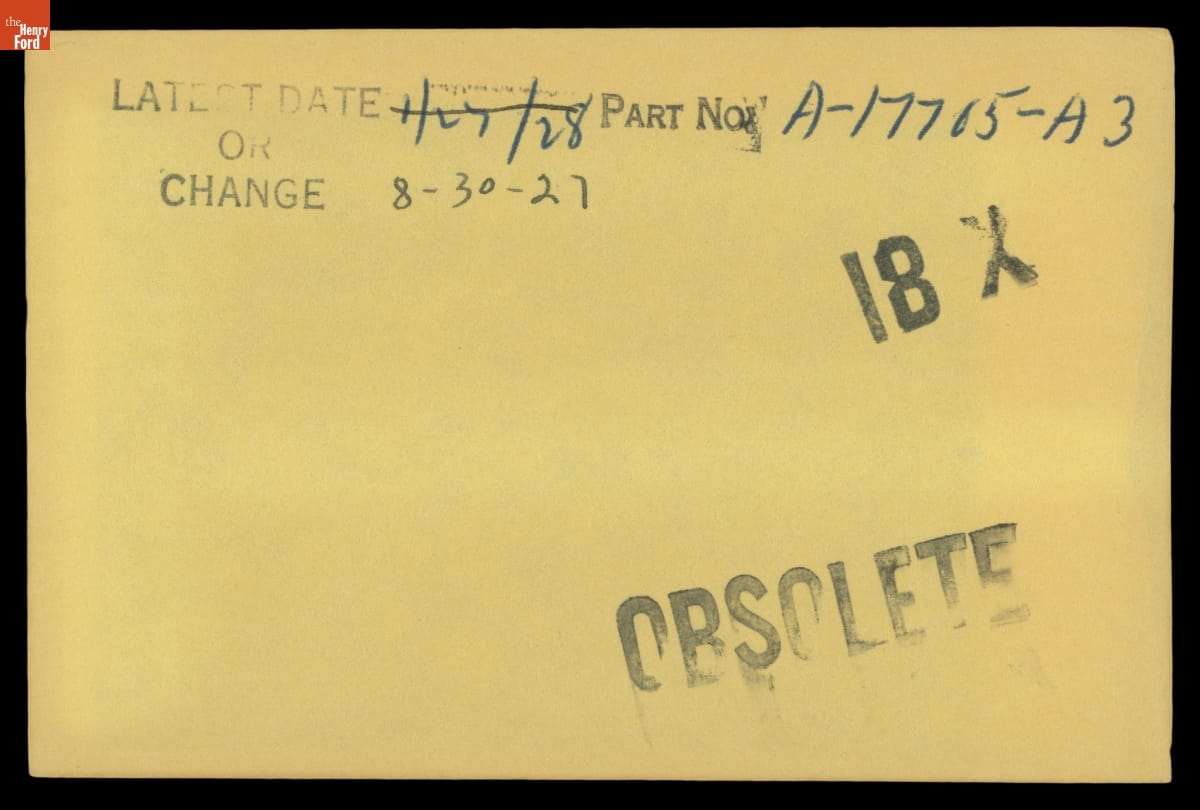 The Ford Motor Company created over a million parts drawings from 1903 to 1957. Many of these drawings specify engineering requirements for the components of Ford-made vehicles--including automobiles, trucks, tractors, military vehicles and Tri-motor airplanes. Others document assembly components, stages of casting and forging, or experimental designs. Beginning in the 1940s, Ford transferred the drawings to microfilm.