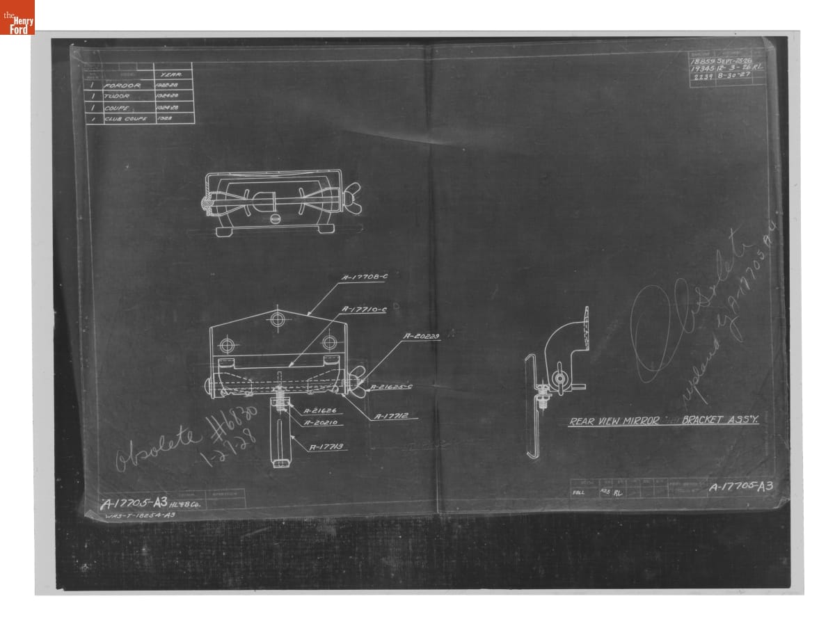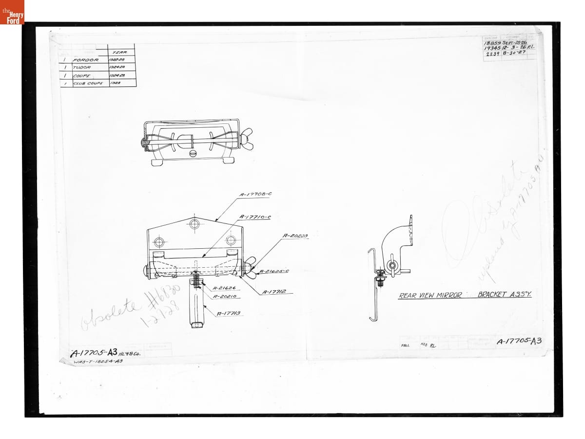Drawing, "Rear View Mirror Bracket Ass'y," Ford Model A, August 30, 1927