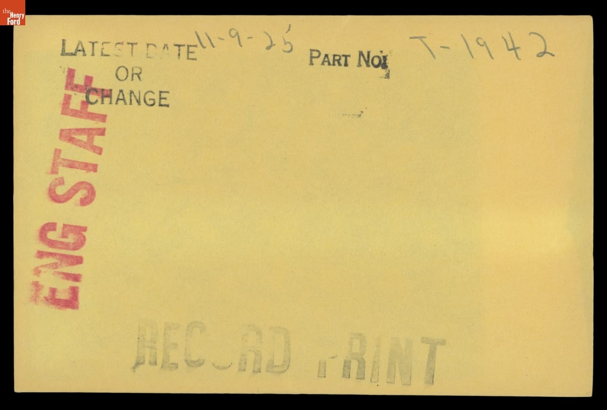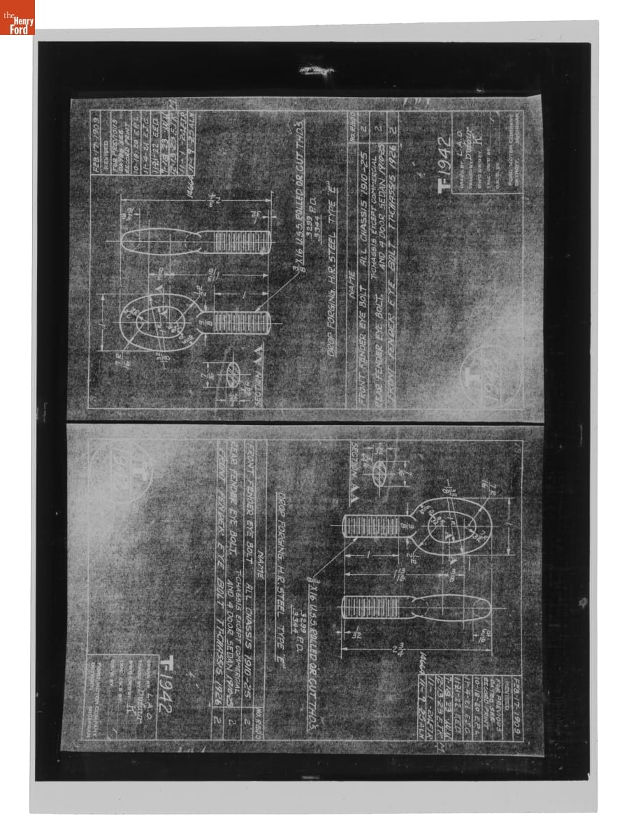 The Ford Motor Company created over a million parts drawings from 1903 to 1957. Many of these drawings specify engineering requirements for the components of Ford-made vehicles--including automobiles, trucks, tractors, military vehicles and Tri-motor airplanes. Others document assembly components, stages of casting and forging, or experimental designs. Beginning in the 1940s, Ford transferred the drawings to microfilm.
