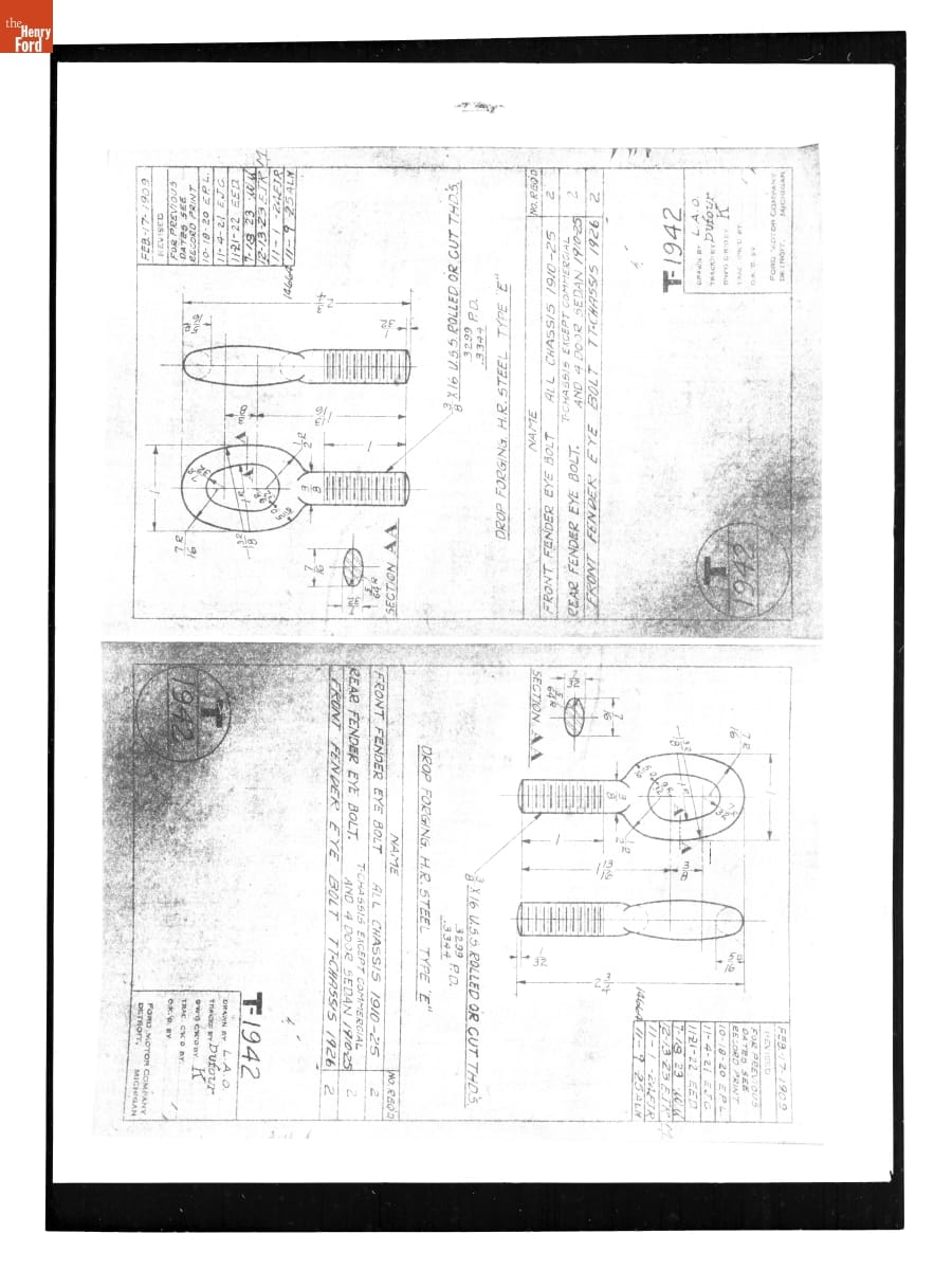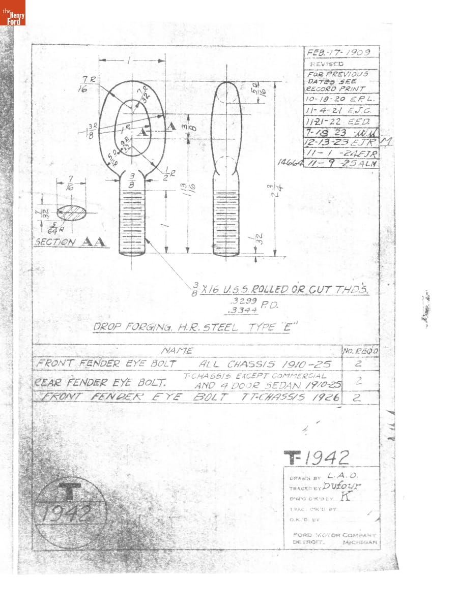 Drawing, "Front Fender Eye Bolt," Ford Model T, November 9, 1925