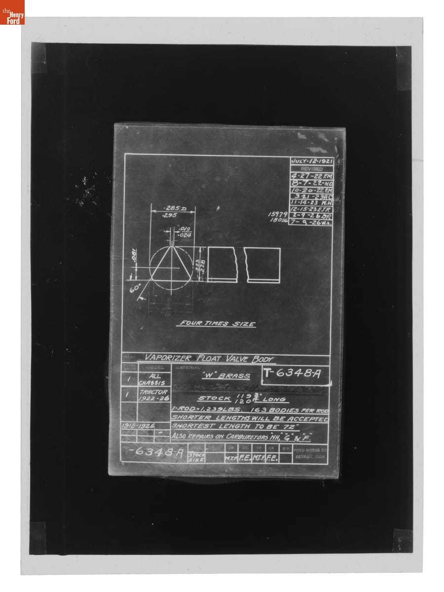 The Ford Motor Company created over a million parts drawings from 1903 to 1957. Many of these drawings specify engineering requirements for the components of Ford-made vehicles--including automobiles, trucks, tractors, military vehicles and Tri-motor airplanes. Others document assembly components, stages of casting and forging, or experimental designs. Beginning in the 1940s, Ford transferred the drawings to microfilm.