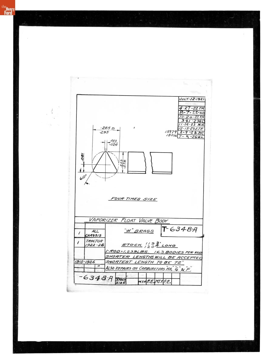 Drawing, "Vaporizer Float Valve Body," Stock, Ford Model T, July 9, 1926
