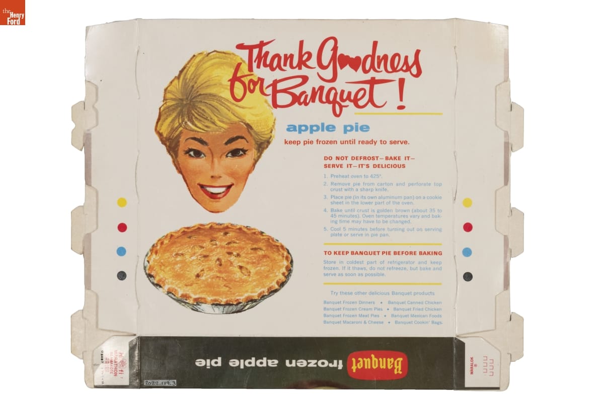 Thank Goodness / for Banquet! / apple pie / keep pie frozen until ready to serve. / DO NOT DEFROST--BAKE IT-- / SERVE IT--IT'S DELICIOUS / 1. Preheat oven to 425[degree symbol]. / 2. Remove pie from carton and perforate top / crust with a sharp knife. / 3. Place pie (in its own aluminum pan) on a cookie / sheet in the lower part of the oven. / 4. Bake until crust is golden brown (about 35 to / 45 minutes). Oven temperatures vary and bak- / ing time may have to be changed. 5. Cool 5 minutes before turning out on serving / plate or serve in pie pan. / TO KEEP BANQUET PIE BEFORE BAKING / store in coldest part of refrigerator and keep / frozen. If it thaws, do not refreeze, but bake and / serve as soon as possible. / Try these other delicious / Banquet products / Banquet Frozen Dinners / Banquet Frozen Cream Pies / Banquet Frozen Meat Pies / Banquet Macaroni & Cheese / Banquet Canned Chicken / Banquet Fried Chicken / Banquet Mexican Foods / Banquet Cookin' Bags