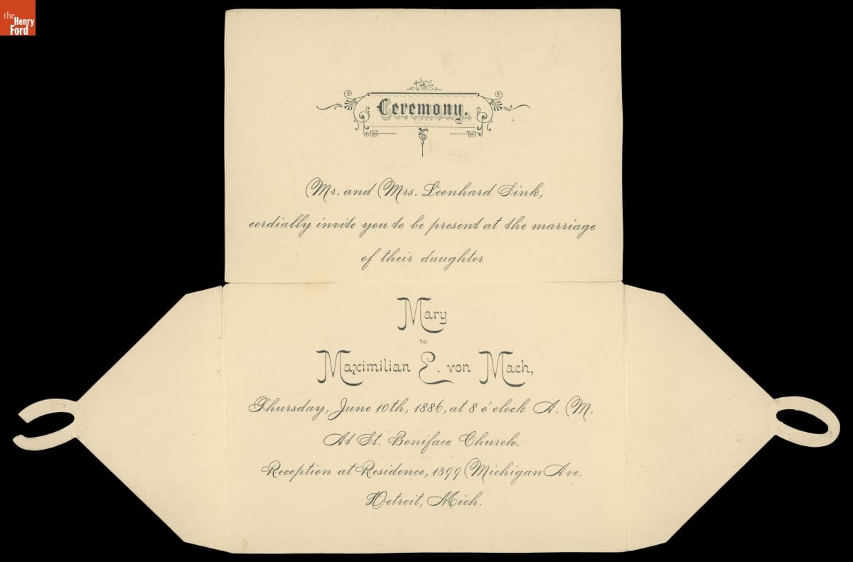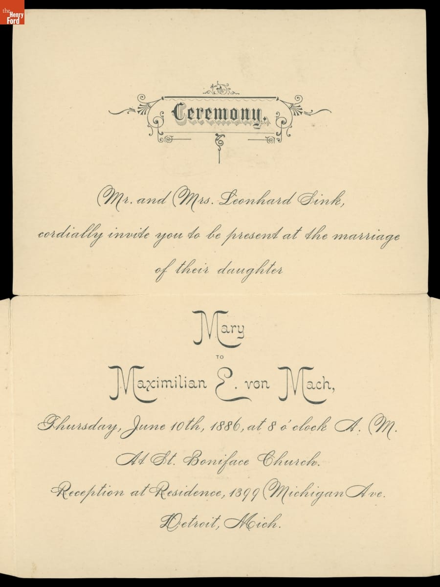 Wedding Invitation for Mary Sink and Maximilian Von Mach, June 10, 1886