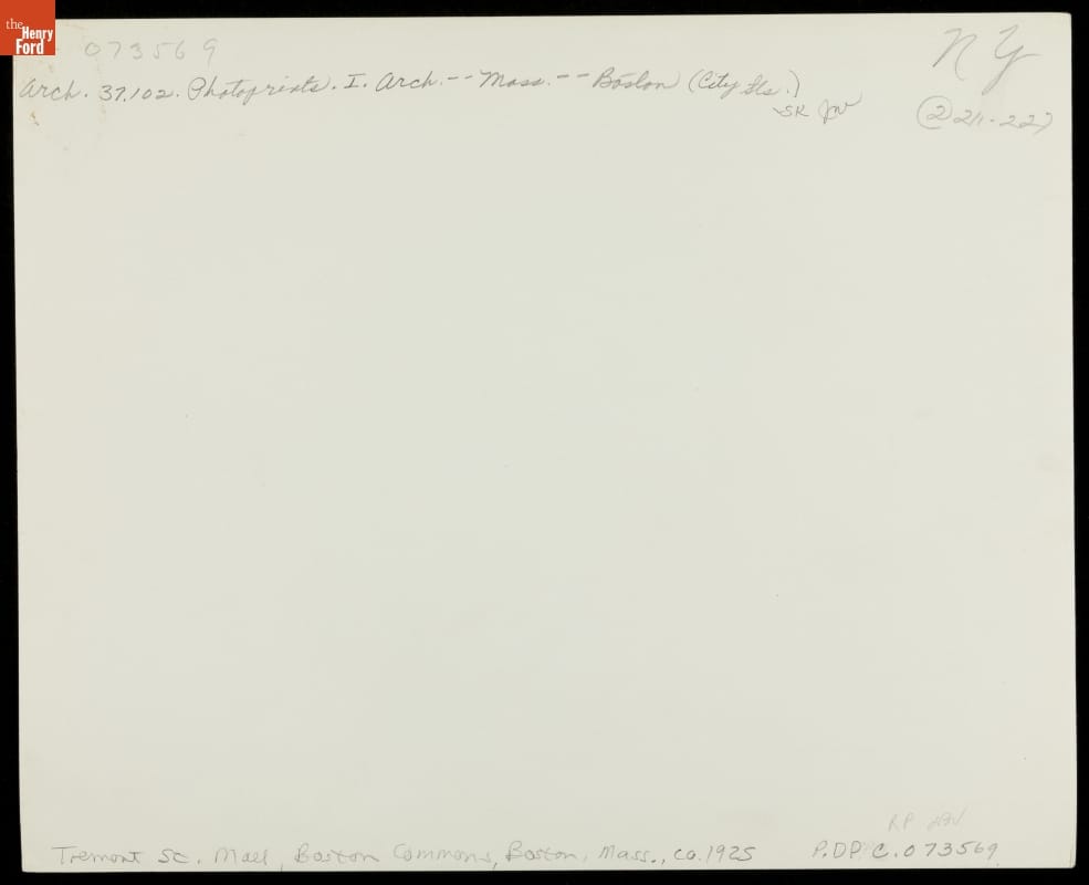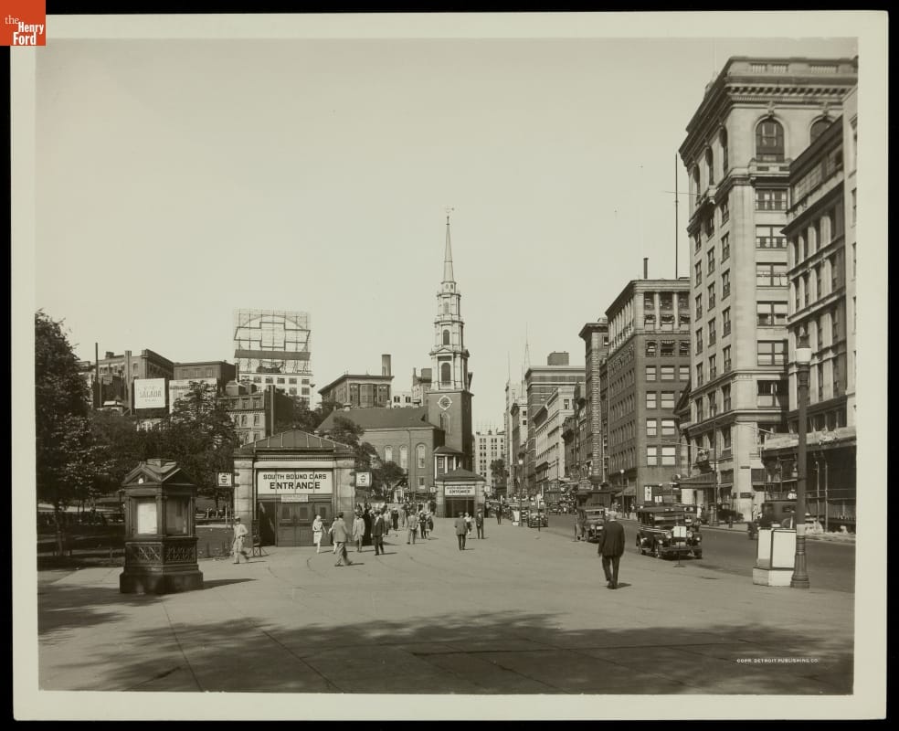 As one of the world's major image publishers from 1895 to 1924, the Detroit Publishing Company had a wide-ranging stock of original photographs. This view of Boston's Tremont Street Mall centers on the steeple of Park Street Church. To the left is Boston Common, the oldest public park in the United States (dating from 1634).