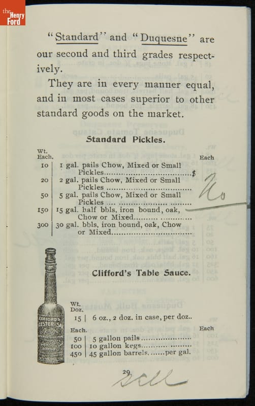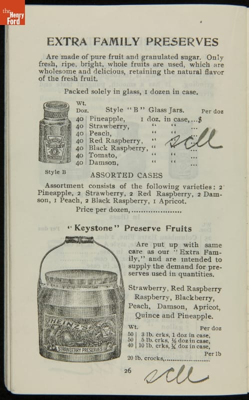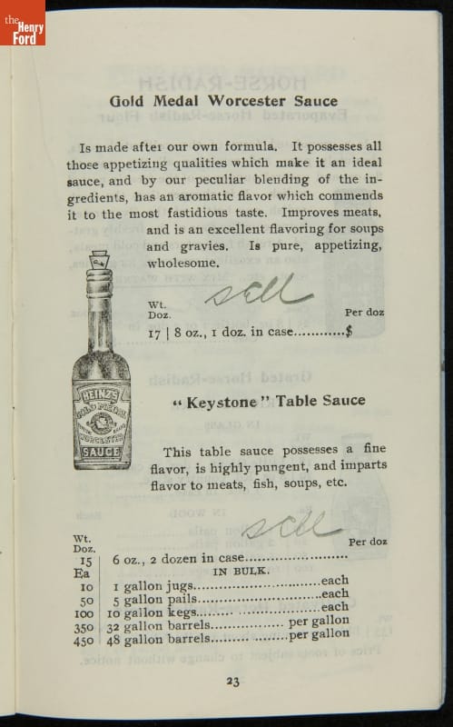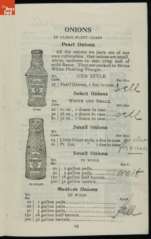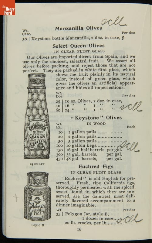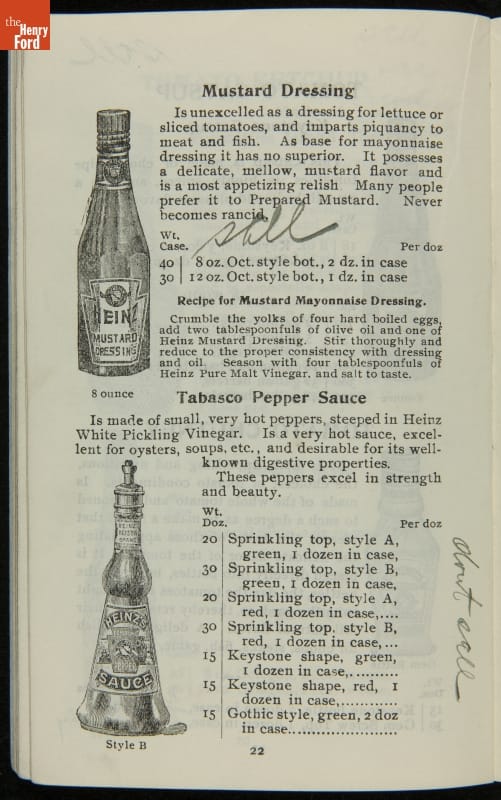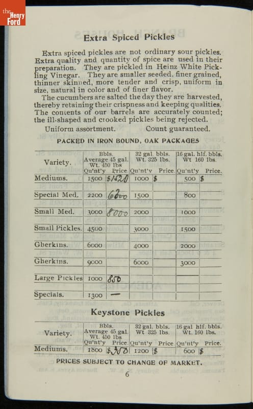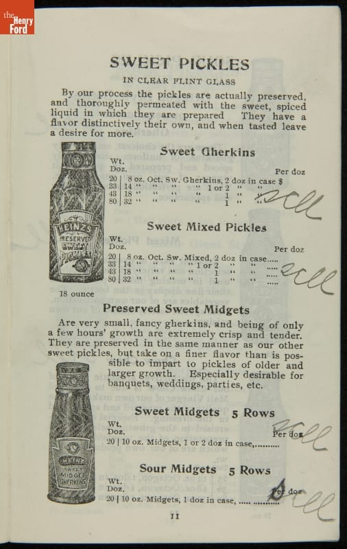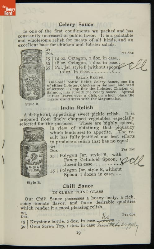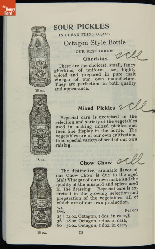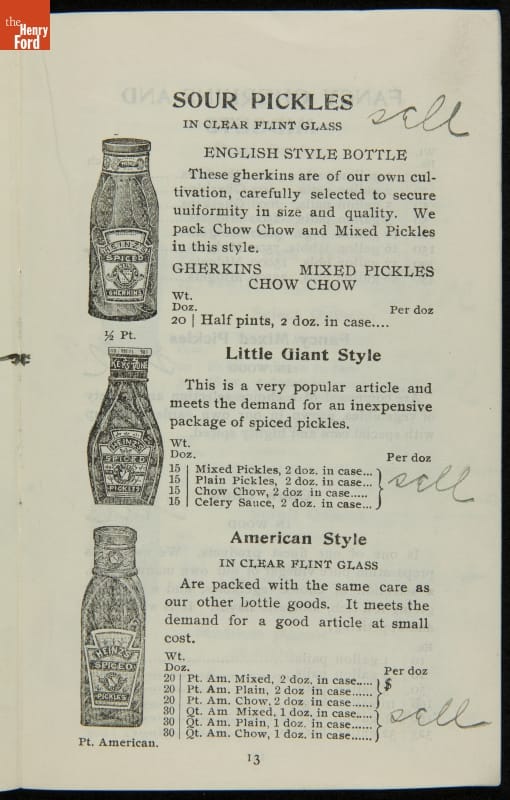 H.J. Heinz came up with the slogan "57 Varieties" in 1892, despite offering more than 60 products at the time. This catalog features descriptions of each Heinz product and provides quantity and price information for merchants, solicitors, and clerks. In this particular catalog the hand-written notes by the person who owned this mark which products he wanted to sell.
