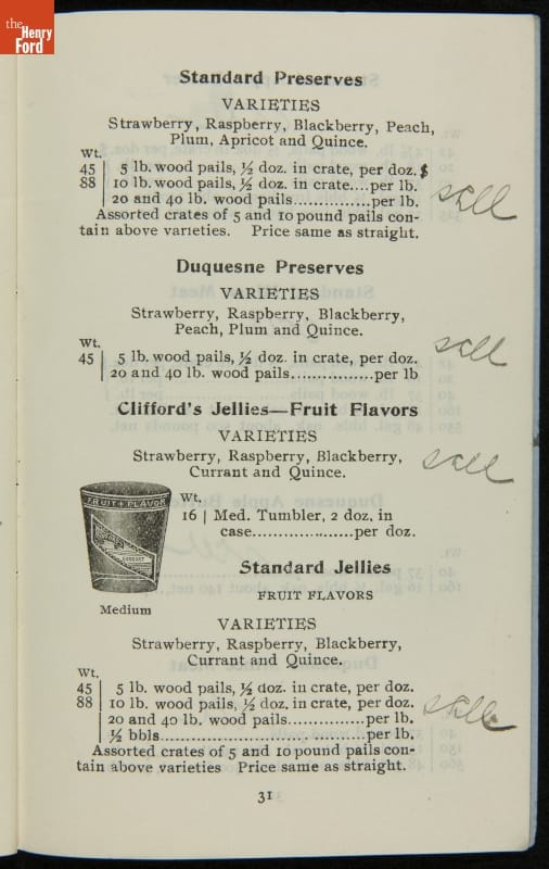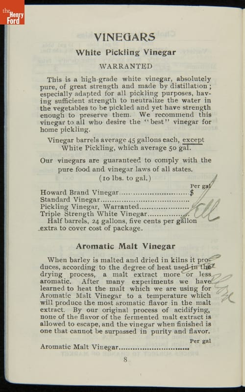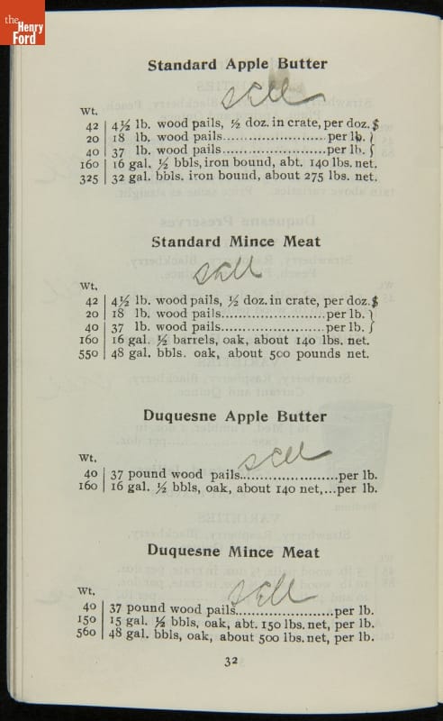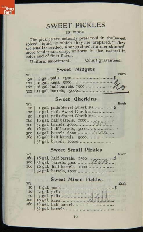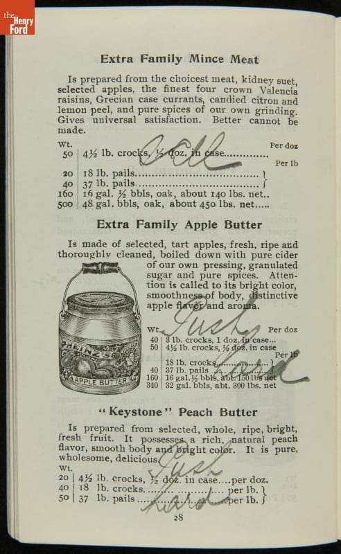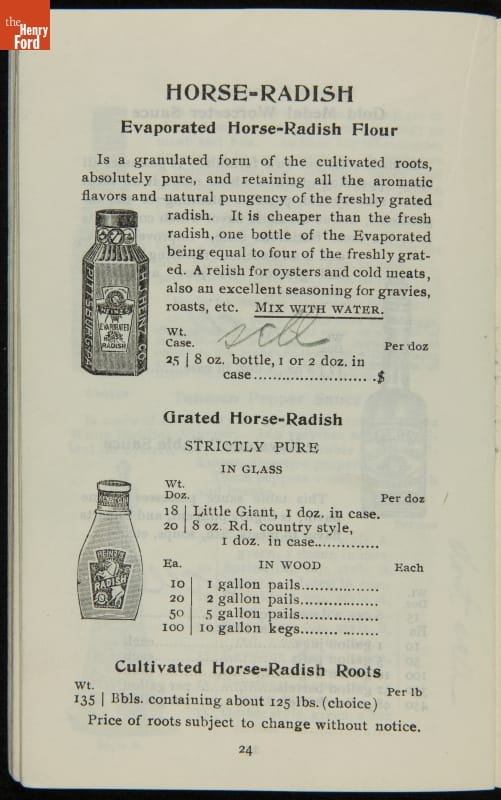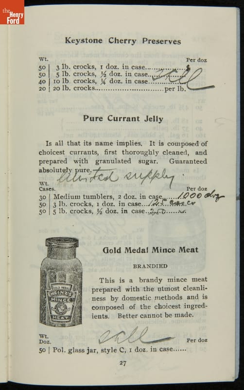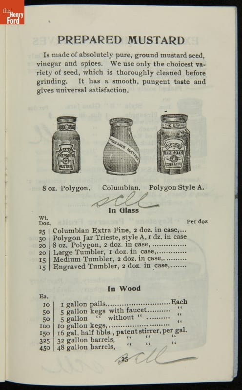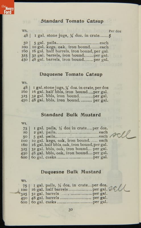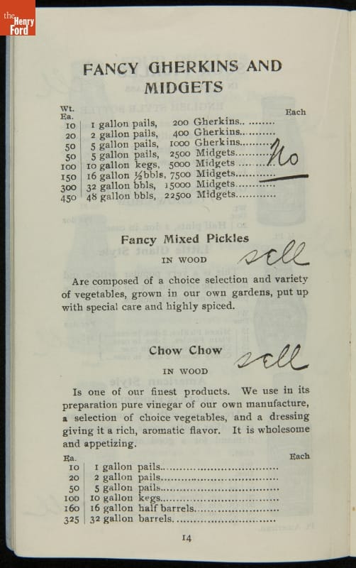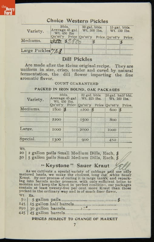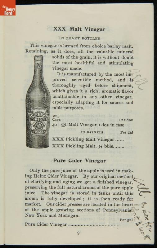 H.J. Heinz came up with the slogan "57 Varieties" in 1892, despite offering more than 60 products at the time. This catalog features descriptions of each Heinz product and provides quantity and price information for merchants, solicitors, and clerks. In this particular catalog the hand-written notes by the person who owned this mark which products he wanted to sell.