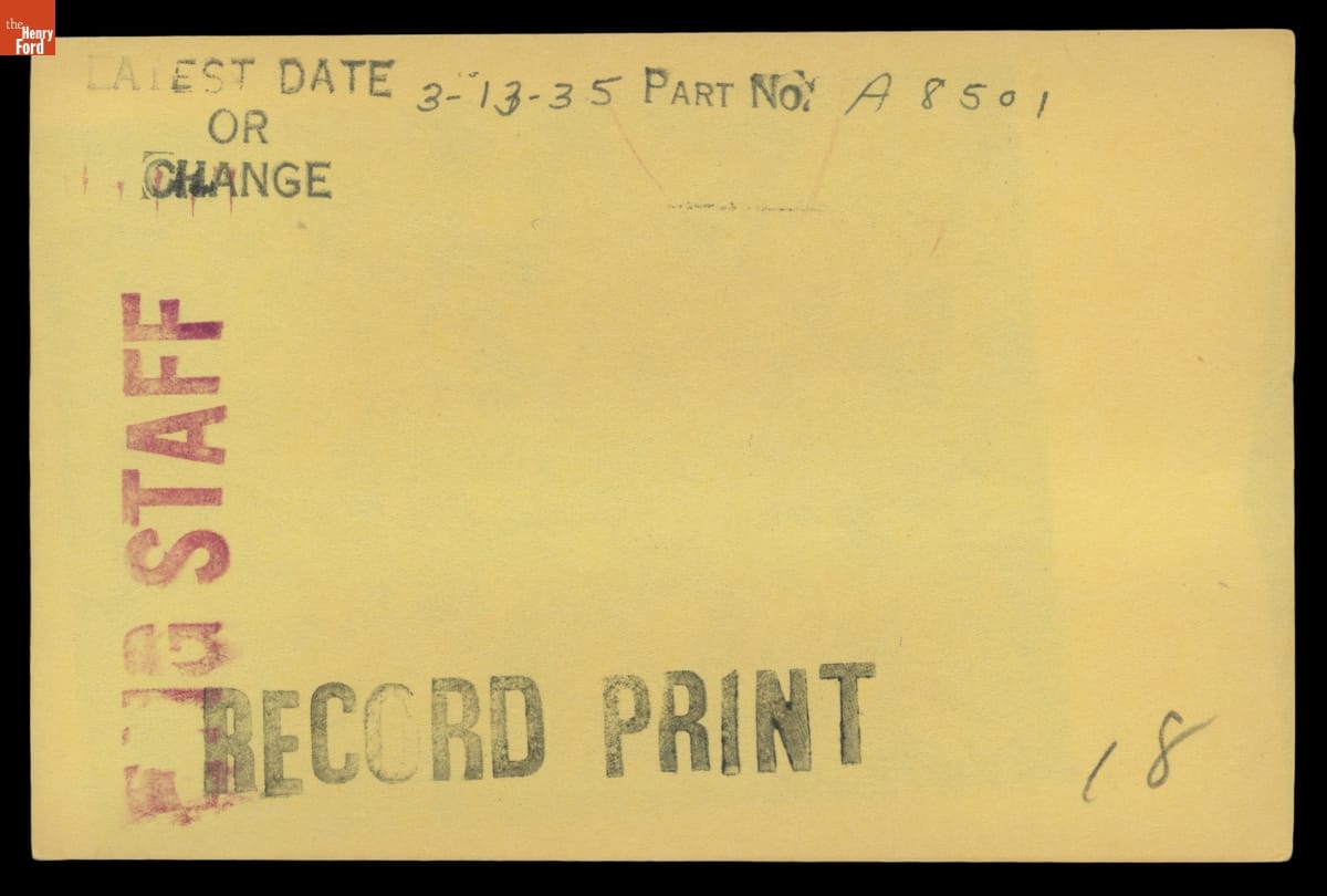 The Ford Motor Company created over a million parts drawings from 1903 to 1957. Many of these drawings specify engineering requirements for the components of Ford-made vehicles--including automobiles, trucks, tractors, military vehicles and Tri-motor airplanes. Others document assembly components, stages of casting and forging, or experimental designs. Beginning in the 1940s, Ford transferred the drawings to microfilm.