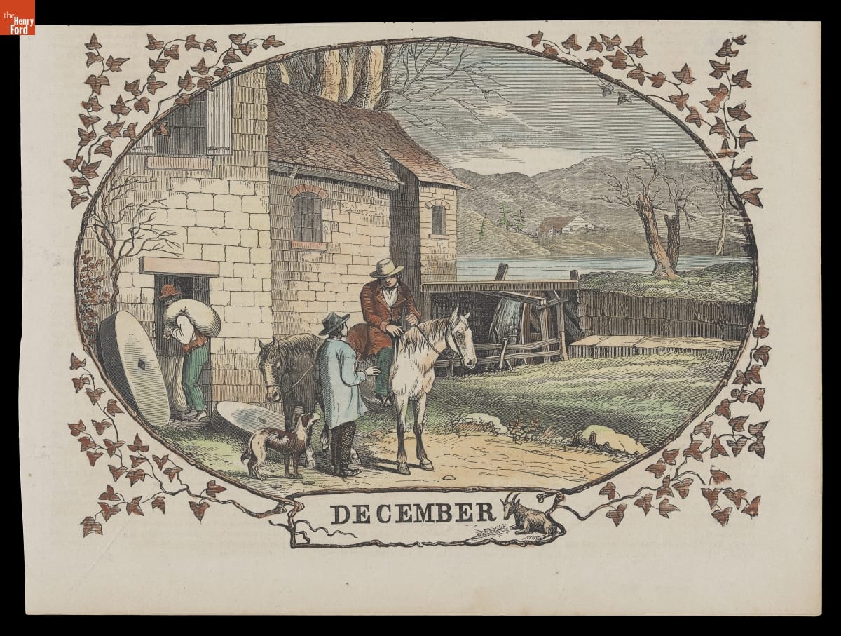 This hand-colored wood engraving depicts farm life in the mid-19th century. Farmers headed to a local mill after harvesting corn, wheat or other grain crops. Here the grain was ground into flour. Farmers kept some of the flour for the family's use, the rest was sold for extra cash and to pay the miller.